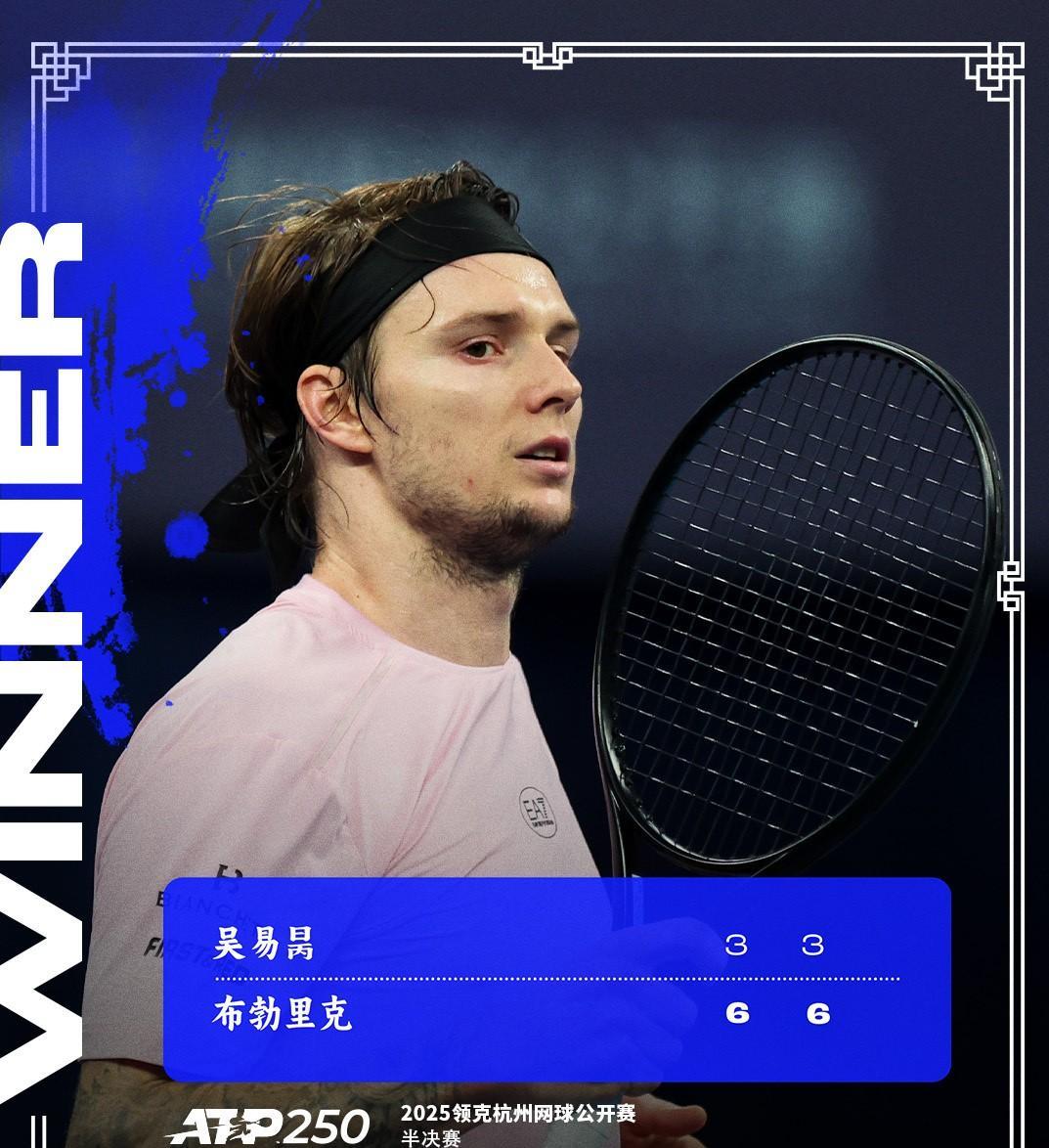 昨夜一战打满三个小时,无缘决赛的结果其实早已注定。杭州ATP250半决赛: 吴易昺以3-6/3-6负于三号种子布勃利克无缘决赛,本周收获100分,即时排名第158位。 连续作战的吴易昺身体过于疲劳,已经退出中网男单资格赛。多出的外卡发给了王傲然,孙发京现在签到替补晋级资格赛。