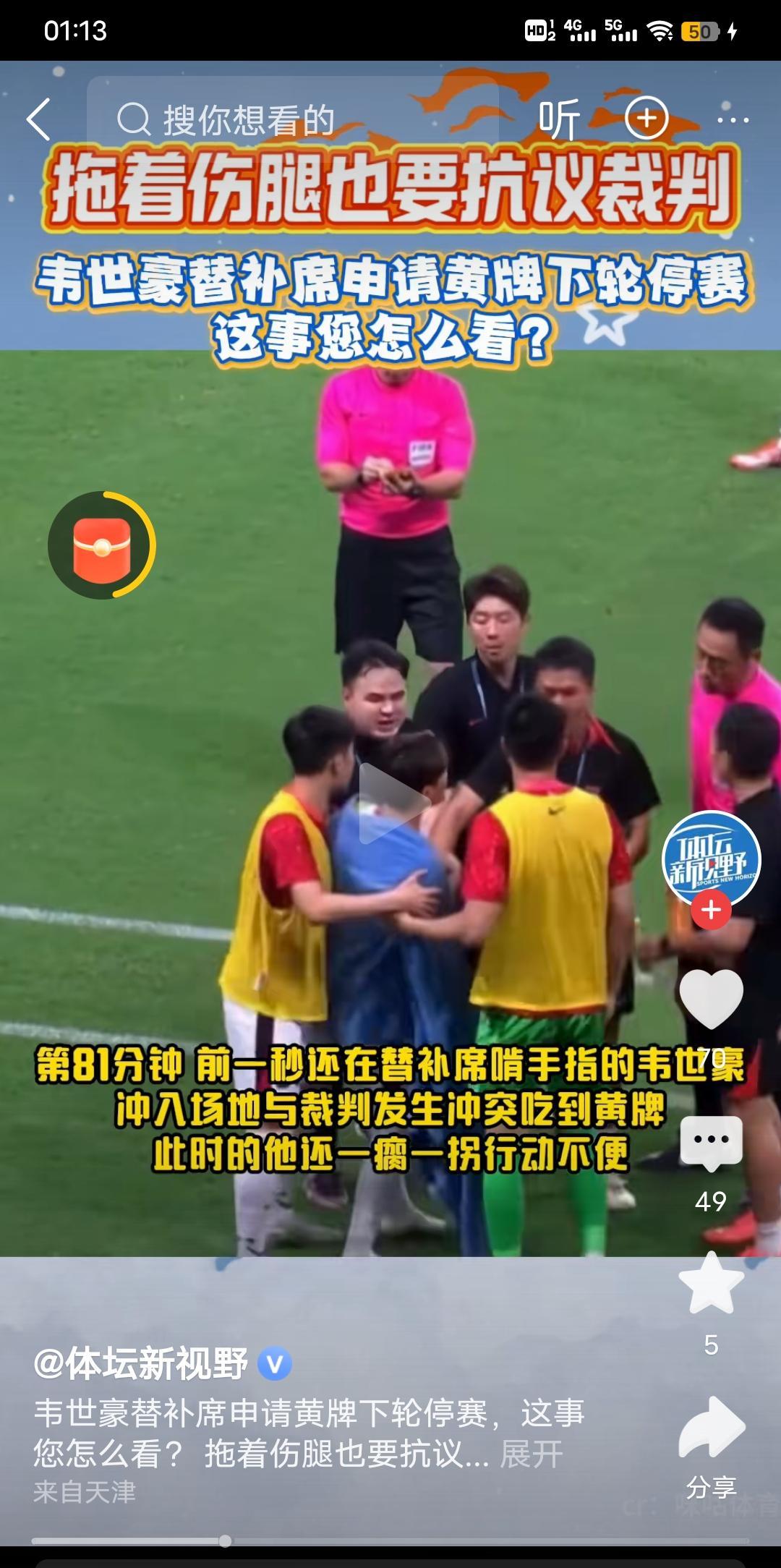 成都蓉城前锋韦世豪啃完手指后向裁判讨要了一张黄牌,累计4张黄牌下轮停赛可以好好休