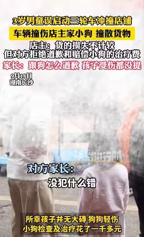 湖南长沙,3岁男童爬到三轮车上玩,结果意外启动三轮车撞倒后方店铺门前的货物,还把店主的宠物狗撞伤,花了1000多元治疗费。店主表示,货物的损失就不计较了,但希望对方道歉,并承担宠物狗的治疗费。但男童的家长却说:人怎么能给狗道歉?我家孩子让你们的货撞伤了,还没找你索赔呢! 据法治进行时报道,9月18日,长沙的一家门市店像往常一样,在店门前码放着整齐的货物,迎接着每一位顾客的到来。店主马女士还把自己的宠物狗也拴在了门口。 马女士正在店里忙碌着,突然被门外的巨响吓了一跳,她在惊慌中看向门外,一辆三轮车把门前的货物撞翻后停在了门前。 马女士赶紧想跑出门外,发现开三轮车的竟然是个很小的男孩,男孩也摔倒在地上。她先扶起了男孩,把孩子交给赶过来的家长。 马女士又发现宠物狗被撞伤了,她赶紧把宠物狗先抱回了店里,又返回店外找到男孩家长了解情况。 原来这个男孩只有3岁,当时他的奶奶正带着他和另外一个孩子在散步。 马女士隔壁的店铺门前停放了一辆三轮车,但车钥匙没有取走。3岁男童爬上三轮车玩,奶奶没有制止,结果男孩误启动了三轮车,撞上了马女士门口的货物和宠物狗。 马女士把宠物狗送去就医,医疗费花费了一千多元,被撞倒的货物也有不同程度的损坏。 她联系男孩的家长,要求对方赔偿损失并赔礼道歉。 对方却认为,狗能值什么钱,人怎么能给狗道歉呢?并表示自己这么小的孩子,并没有犯什么错。 关于店主要求的赔偿,对方却称,狗是被货物撞伤的,不该来找自己的麻烦,自己孩子也被货物撞到了,自己可都没说什么。 店主马女士称,男孩家长表示肯定不会再回到店里赔偿和道歉的。 马女士与对方协商无果,选择了报警,并表示,货物损失可以不追究,但宠物狗的医疗费要求男孩家长承担。 《民法典》第二十条的规定,不满八周岁的未成年人为无民事行为能力人。 男孩在玩耍时,误启动了三轮车,撞上了马女士的货物和宠物狗,造成货物损失和宠物狗受伤的后果。 2、三轮车车主应负未尽到安全保障义务的责任。 三轮车车主作为车辆的管理人,在公共场所,有义务对车辆进行妥善保管和确保安全。 车主没有取走钥匙,在一定程度上给男孩误启动车辆创造了条件,车主的做法视为未尽到完全的安全保障义务,存在一定的过错,应承担一定赔偿责任。 对于本事件中,男孩家长本可以用正确的处理方式让孩子得到一次宝贵的教育机会。 可他们这种拒绝赔偿的做法,却体现了家长相反的教育态度,有可能让三岁孩子在思想中形成自己不用对自己的行为负责的错误认知,很可能影响孩子在成长过程中树立正确的价值观。 其实家长对于这一事件,您还有哪些看法,欢迎留言讨论。