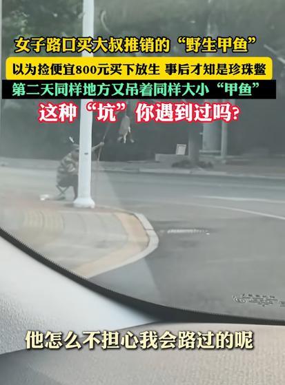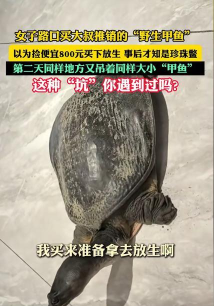 肠子都悔青了!”近日江苏,一女子在路边花800块买了只20多斤的“野生大甲鱼”,本打算放生,结果第二天又见卖甲鱼的大叔在同一地点售卖。女子纳闷:“他不是说工地捉到的吗?怎么还有?”跟朋友一说,听完朋友的话,她肠子都悔青了! 据小强热线浙江教科9月19日报道,一名女士花了800块钱买了一只大鳖,本来想着做件好事,结果却落入骗局。 事情的起因是在几天前,小周(化名)开车回家的时候路过了一个十字路口,看到有一位穿着得体的大爷,吊着一个大大鳖,瞬间勾起了她的好奇心。 等小周走上前的时候,大爷给她她介绍说这个不是普通的鳖,而是“野生甲鱼”,说完之后大爷还将自己提前录好的抓捕视频给小周看。 这套说辞正好击中了小周的心里,有了视频作为依据她就更加相信了是野生的,于是小周就想着自己买回家然后给它放生,就算是做一件好事。 随后她给大爷讲了讲价之后,就以八百元的价钱将这个野生甲鱼给买了下来,到家之后小周还故意给好友炫耀说自己买了一个野生的,不料朋友看了之后就说小周被骗了。 听了好友的话之后,为了检验一下是不是真的被骗了,第二天小周又开车来到了这个地方,然而令他惊讶的是,大爷不仅挂着一样的鳖就连说辞也一模一样。 随后小周回家之后在网上了解到自己买的这个鳖的品种,是从北美引进来养殖的水产 珍珠憋,所以能够能轻松长到几十斤,而且它的背甲前缘较圆滑,有数列疣粒。 但现在这个鳖让小周犯了难,因为这个鳖不仅吃得多而且繁殖能力也巨快,所以让把它放到大自然中那简直就是一场灾难,但养又养不了一辈子,左右为难。 网友看到了之后在下面评论说,这么大一只,不敢想象嗦它裙边的时候该有多香。 想放生,应该通过正规渠道,比如联系相关保护组织或动物救助机构,而不是随便相信路边人的一套说辞。否则,本想做善事,最后可能变成帮倒忙,还对自然造成不可逆的影响。