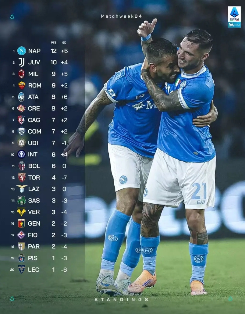 意甲第四轮综述—— 1、联赛排名基本恢复正常,前五名基本上应该就是本赛季的最终结