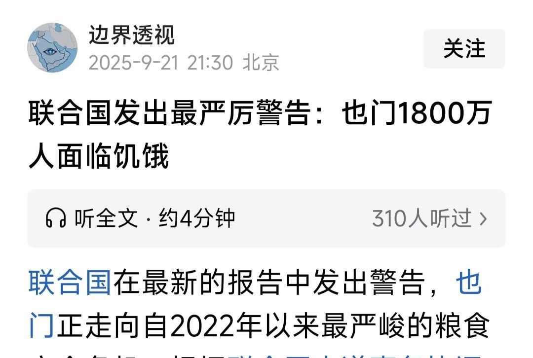 联合国发警告:也门1800万人面临严重饥饿状态,呼吁国际社会提供资金粮食援助,解