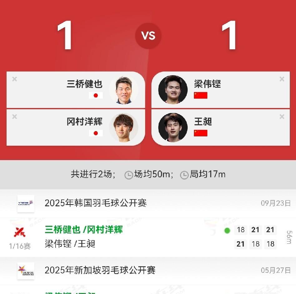 2025年韩国羽毛球公开赛,男双1/16赛梁伟铿/王昶21-18,18-21,1