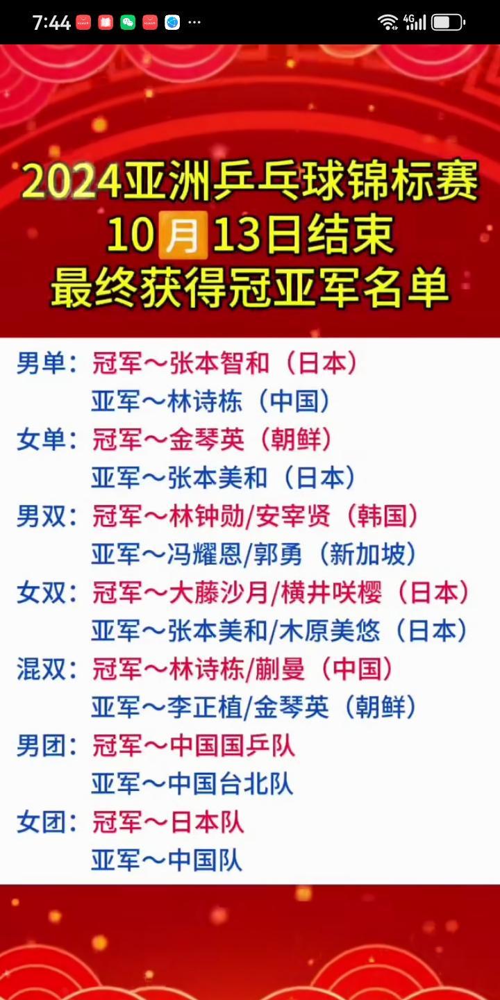 2024WTT首届中国大满贯,国乒包揽了所有冠军,女单包揽4强,男单包揽4强,女双冠亚军,男双冠亚军,混双冠亚军。这么好的成绩,解说嘉宾邓亚萍夸奖国乒引领世界技术 谁能想到无缝衔接的亚锦赛,国乒溃败,只获得男团一个冠军,混双林诗栋/蒯曼一个冠军,女团一个亚军,男单林诗栋一个亚军,女团亚军主教练马琳指导都没上领奖台。 中国大满贯主场作战队员们都拼尽全力后,身体上心态上都没得到调整影响了发挥,今年的亚锦赛还是和大满贯无缝衔接 亚锦赛今年只有团体,国乒也会记得去年的教训一定会做好调整。加油加油。