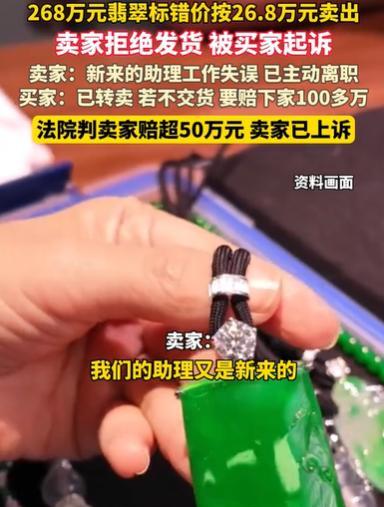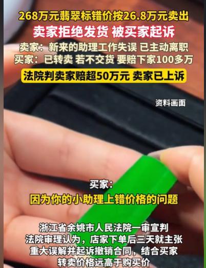 李女士(化名)平日里对翡翠珠宝极为痴迷,也常常在各个珠宝交易平台寻觅心仪的宝贝。一次偶然的机会,她在一家店铺里看中了一块翡翠。 那块翡翠色泽温润,质地细腻,在灯光的照耀下散发着迷人的光泽,而当她看到价格标签上写着26.8万元时,心中不禁一动,觉得这简直就是一个难得的捡漏机会。 她没有过多犹豫,迅速下单并支付了款项。在她看来,这块翡翠有着极高的收藏和转卖价值。果然,不久后她就找到了合适的买家,以超过100万元的价格转手卖出,并且顺利收到了买家的定金。 此时的她,沉浸在即将获得高额利润的喜悦之中,仿佛已经看到了财富在向自己招手。然而,命运似乎和她开了一个巨大的玩笑。就在她刚收了定金不久,突然接到了卖家的电话。 卖家在电话那头焦急地解释,那块翡翠实际价格是268万元,是新来的助理工作失误,在标价时少给了一个0,才导致价格变成了26.8万元。卖家表示,他们要撤销订单,不会发货。 这个消息如同晴天霹雳,让李女士瞬间从喜悦的云端跌入了焦虑的深渊。她深知,自己已经和下家谈好了转卖事宜,并且收了定金,如果卖家不发货,她将面临违约的风险,需要赔偿下家100多万元。这对于她来说,无疑是一笔巨大的损失,是她无法承受之重。 女子坚决不同意卖家的要求,她认为交易已经达成,卖家就应该按照订单发货。她开始与卖家进行多次沟通,试图说服卖家履行交易。但卖家态度也很坚决,坚持认为是助理的失误导致价格错误,交易不能算数。双方各执一词,争执不下,矛盾逐渐升级。 随着事情的发酵,这一事件引起了广泛的关注。女子在无奈之下,只能寻求法律的帮助。她将卖家告上了法庭,希望通过法律途径来解决这场纠纷,让卖家按照原价发货。 在法庭上,双方展开了激烈的辩论。卖家详细阐述了新助理工作失误的情况,提供了相关的证据,试图证明这是一次重大误解导致的错误定价。而女子则强调交易已经成立,卖家应该遵守契约精神。 经过一段时间的审理,一审宣判。如果卖家不发货,会导致女子损失50万左右,因此法院判决卖家要赔50多万。 这一事件在网络上引起了网友们的热议。有网友表示:“这女子也是够大胆的,这么低的价格就敢买,转手卖高价,风险肯定大啊。” 也有网友对卖家说:“虽然是助理失误,但作为商家,也应该更加谨慎,避免出现这样的错误。” 还有网友感慨道:“在商业交易中,契约精神固然重要,但有时候一些意外情况也确实让人头疼,希望以后大家都能更加谨慎,避免这样的纠纷发生。” 对此你怎么看?欢迎大家在评论区留言讨论。