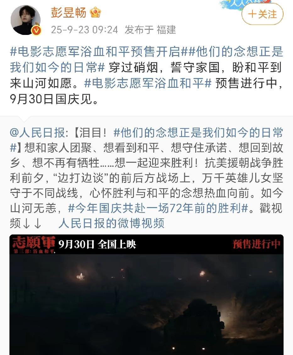 张子枫彭昱畅为电影《志愿军》宣传! 9月23日,张子枫、彭昱畅纷纷转发了人民日报关于电影《志愿军》的宣传内容,两人官宣电影《志愿军浴血和平》预售开启,9月30日上映。 在片段中,看到了张子枫和彭昱畅的精彩表演,让人更想走进电影院去看了。 好期待上映的那一天,喜欢这部电影的可以预约了。