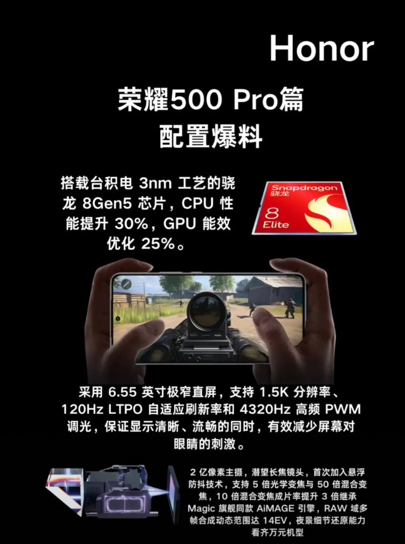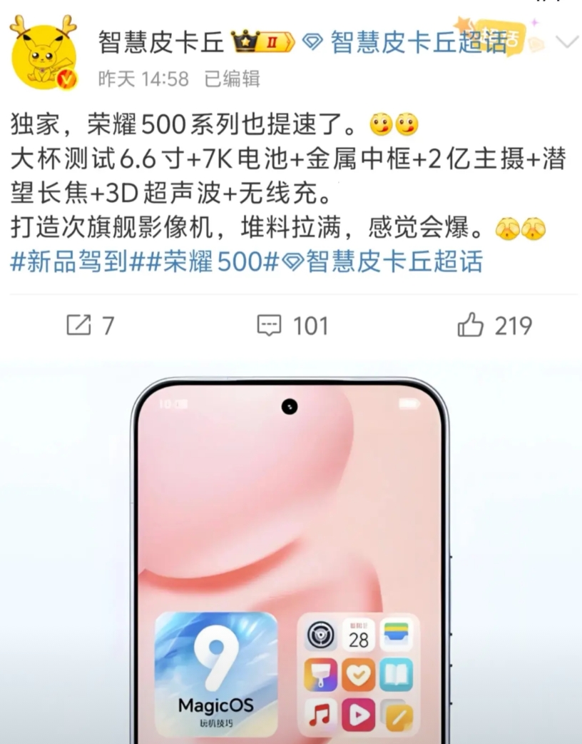 Magic8还没摸到,荣耀500系列发布又提速?这节奏太上头了,友商直接蒙圈了!听说荣耀500 Pro有7000+大电池,续航提升,还有金属中框、2亿像素主摄、潜望长焦镜头,3D超声波指纹识别和无线充电也没落下。荣耀这是不鸣则已,一鸣惊人啊,把好东西全塞新机里。坐等真机,看看销量能不能超越荣耀400!