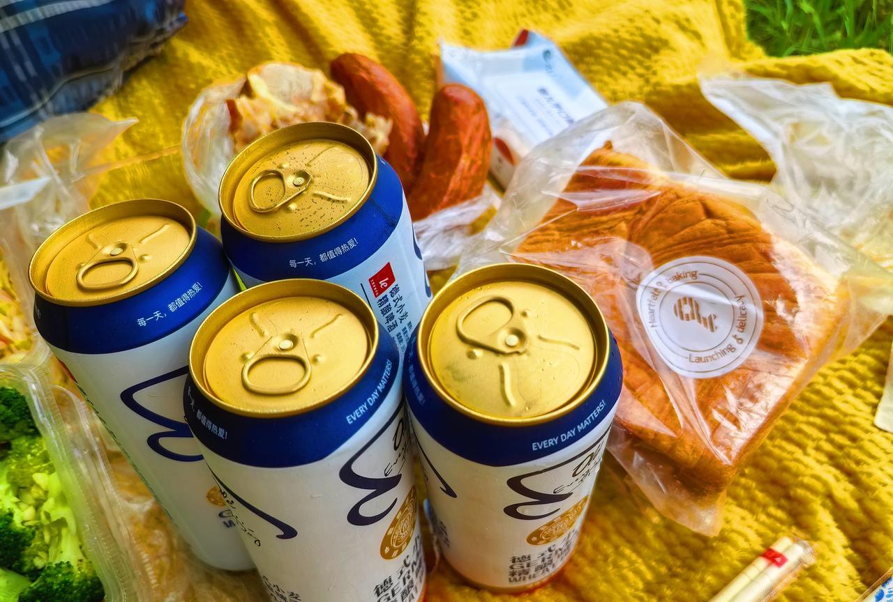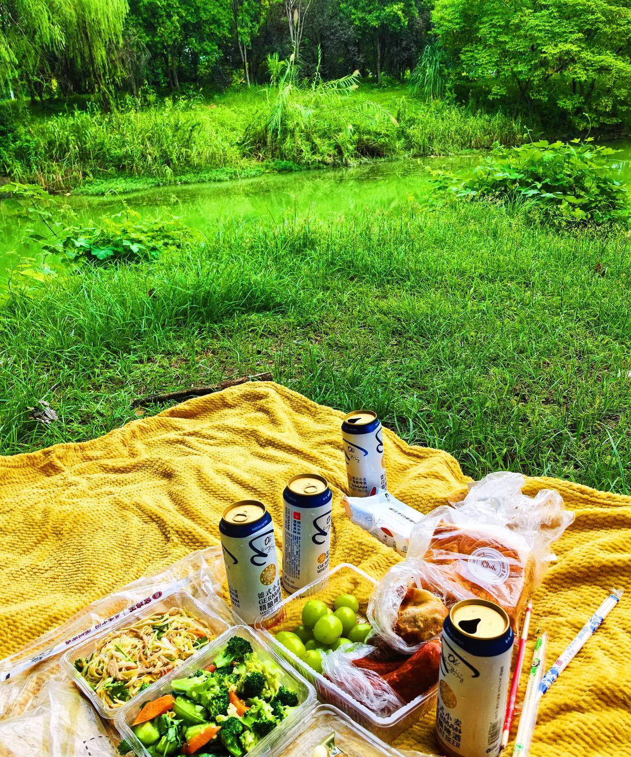 回杭州的第三天,我跟孩儿他爹去钱塘江边野餐。 在哈尔滨呆了两个月,本来计划好的跟亲戚野餐、跟闺蜜野餐都泡汤了,心里总觉得有点小遗憾。 今天琢磨去哪玩儿,我想去趟湘湖。我老公提议:那咱俩不如带点东西上那吃得了,就当野餐了!艾玛,这主意太好了,正合我意。 早上起来我就开始准备食材。拌了一个家常凉菜,炝了一个西兰花和黄瓜条,带上一只鸡腿、两根红肠、两个煮鸡蛋、阳光玫瑰葡萄、4听啤酒,还有米旗面包。当然大蒜瓣也不能少。 啤酒头天晚上就搁冰箱里镇上了。我拎着凉菜,其他东西装进双肩包。 感觉东西有点少,我想再带点熟食。老公说足够了,吃不了还得背回来。 做好了去湘湖的准备。老公又说:咱俩不就是想去野餐吗?那就没必要跑那么远,上钱塘江边得了。 我说也行啊,咱俩背着大包小裹也没法游湖,哪天轻手利脚的再去吧。 下沙这边离钱塘江很近,我俩一人骑上一辆免费的小红车,一路欣赏初秋的美景,半个小时就到了钱塘江边。 钱塘江大桥非常壮观。今天依然很闷热,游人不多,钓鱼的不少。 大坝下面都是茂密的小树林,我们找了林荫下面的一块草坪,旁边还有一个池塘。简直可以说是风水宝地。就这儿了! 铺上小毯子,把吃的全部拿出来摆上。其实我们吃完早餐撂下筷子就出发了,一点都不饿。但一看这地方绿草如茵,水流潺潺,特别有感觉,就想整两口。趁着啤酒还没有凉,开喝! 一边儿吃着自带的小食,一边喝着凉啤酒,一边玩手机,仿佛置身于世外桃源,还有一丝丝小凉风助兴。哎呀妈呀,这就是我向往的退休生活呀。 哈哈,说好的回来减肥呢?不过减肥也不能一蹴而就,得循序渐进,慢慢来,有个适应的过程,对不对?[偷笑][偷笑]