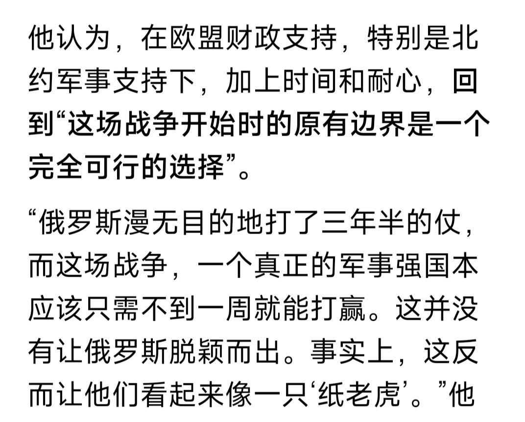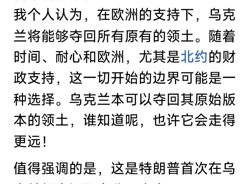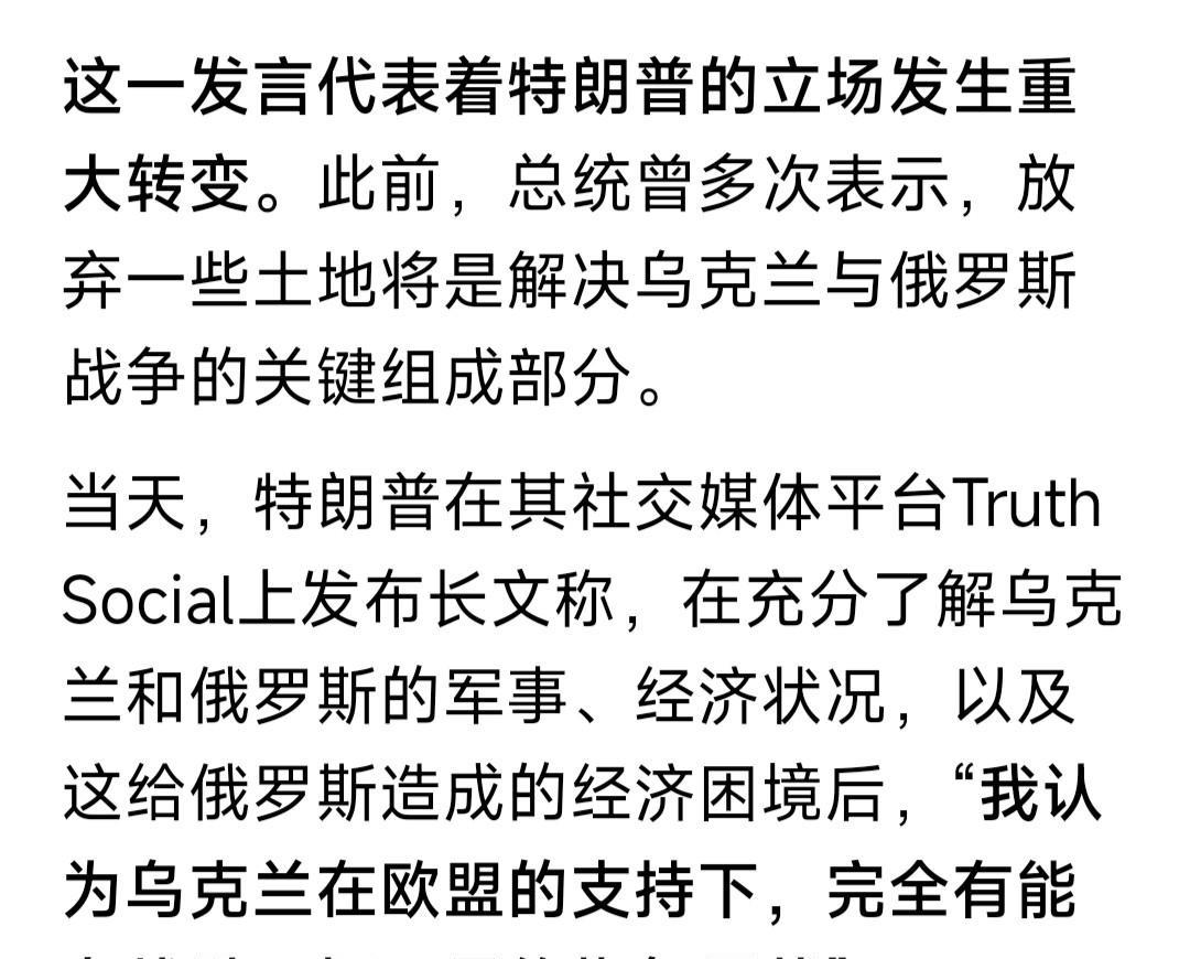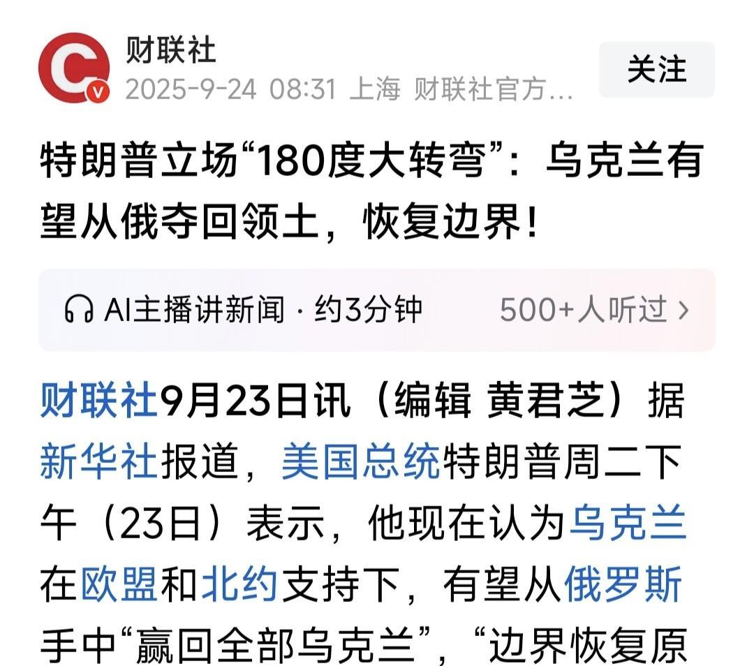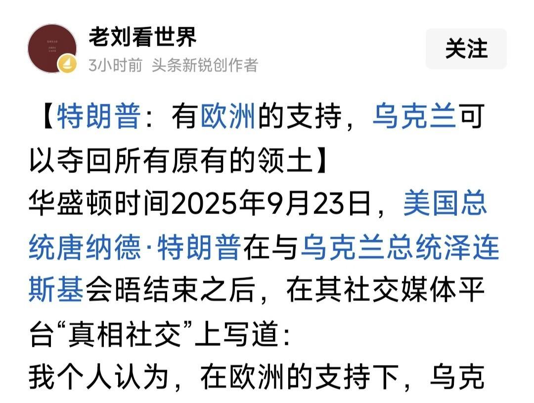 特朗普联大见小泽,态度发生大逆转!坚定挺乌抵抗到底,相信有你们的勇敢战斗,定能恢复到原来的边界! 他指出实现这个目标的三大条件: 1.有强大美国做后盾,坚定支持到底。 2.有欧洲坚定支持,保障资金买武器。 3.美欧联手加大制裁,扼杀大鹅经济! 三大条件中,前两个正在进行!继续抵抗很重要,互相消耗谁吃不消?眼下双方都已力竭,远程攻击乌已占上风。继续打下去,结果是啥?傻子都知道! 第三个条件正在进行,欧盟已通过第19轮对俄制裁措施,只等各成员国议会批准后实施。但美国并不急于行动,因欧盟尚未完全停购俄油。一旦欧洲完全停购,美国立即加入最新制裁行动! 当然老特没忘指责中印,说如果中印不买俄石油,战争马上就能结束!但他忘了一件事,中俄油气贸易始于战争前,而且签了30年,怎能说断就断呢?至于印度巴西与俄贸易,是另回事。 看眼下局势,川普对俄乌态度大逆转,对俄极为不利。此前几度反复,变化无常,想让乌土地换和平。现在又回到支持乌抵抗到底政策,对谁有利呢? 对于他说:相信乌能恢复到“原来边界”!原来哪个边界?是2022年俄发动军事行动前的边界?还是2014年俄占领克里米亚前的边界?他没有说明白。 苍狼还是那句话:一切皆有可能,一切不可预测!识时务者为俊杰,当断不断必受其乱。留得青山在不怕没柴烧。解铃还须系铃人,回到原点皆安好! …………
