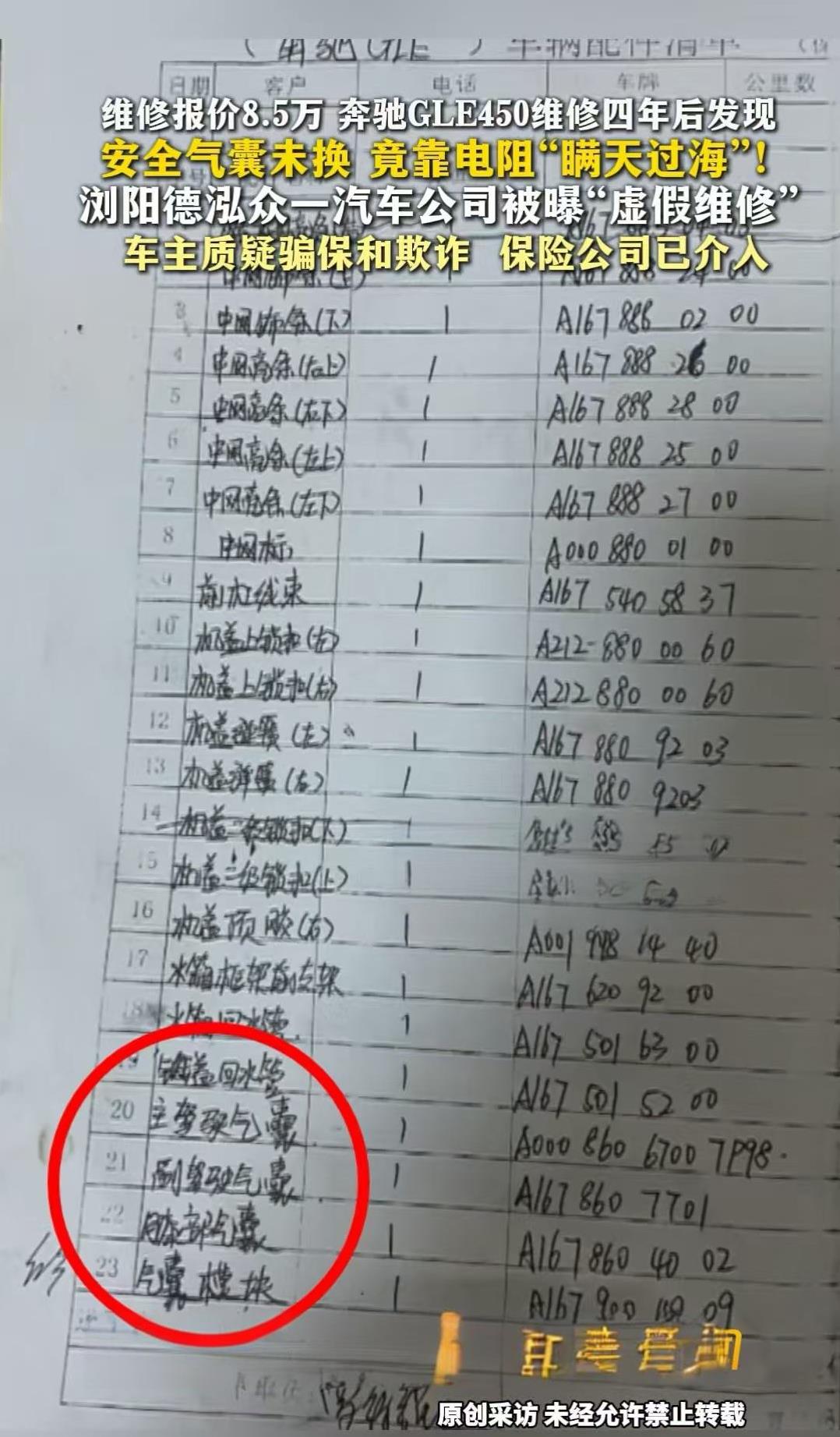湖南,女子的奔驰车在四年前发生了车祸,维修了8万多,现在发现三个气囊居然没有更换