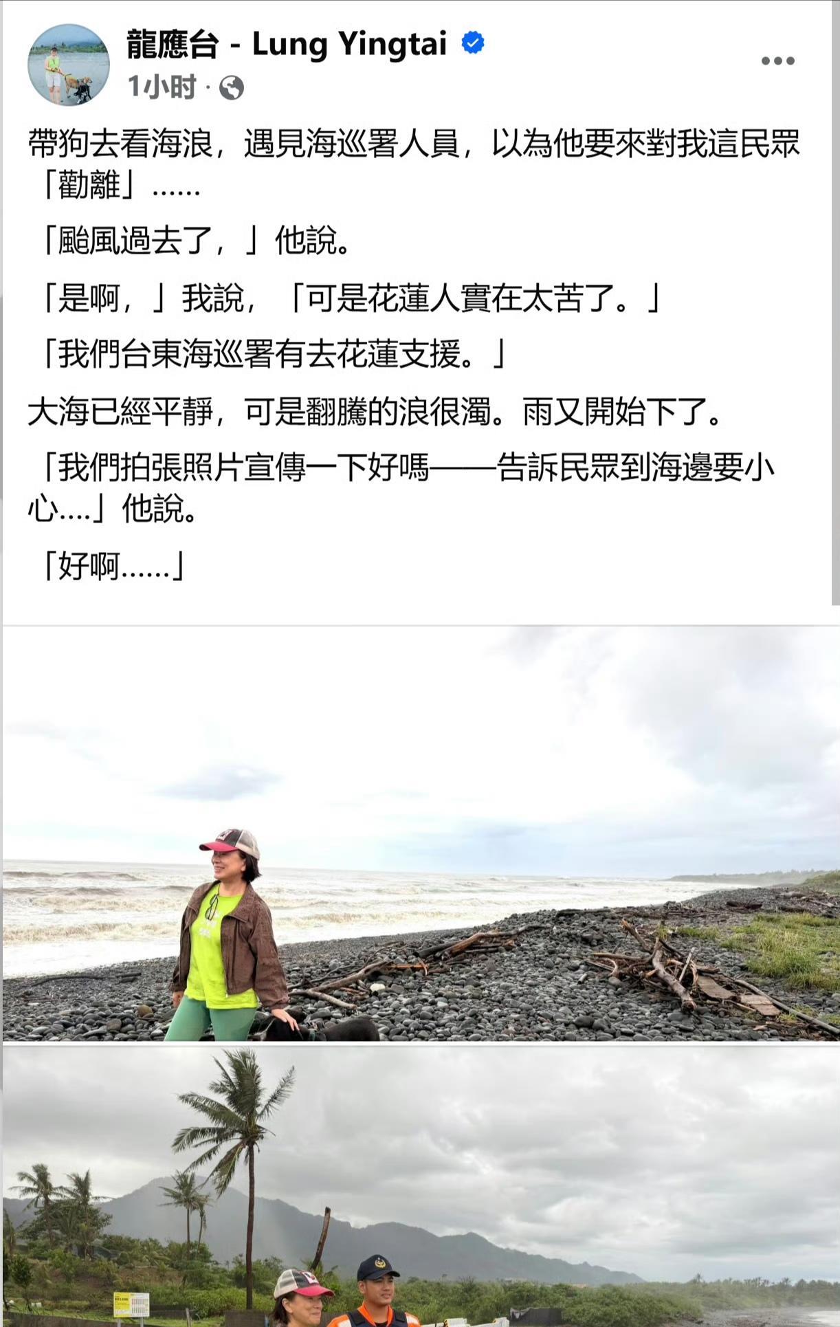 台湾省花莲民众哭诉所遭受的台风灾害,而龙应台则晒“美照”发文带狗去海边看海浪!