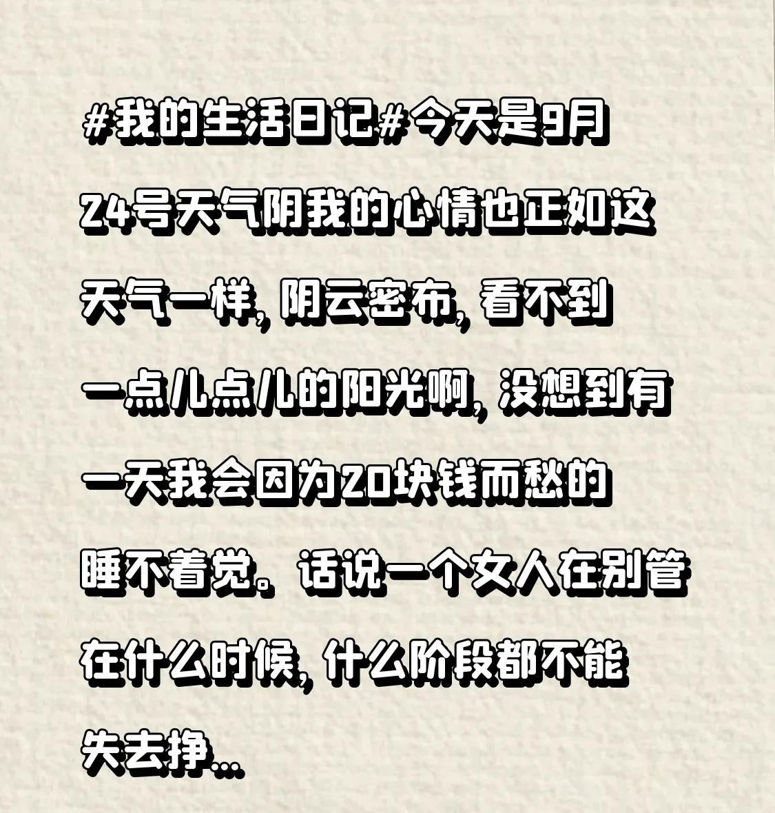 #我的生活日记# 今天是9月24号天气阴 我的心情也正如这天气一样,阴云密布,看不到一点儿点儿的阳光啊,没想到有一天我会因为20块钱而愁的睡不着觉。 话说一个女人在别管在什么时候,什么阶段都不能失去挣钱的本事。 80后的我没想到有一天会因为20块钱给我带来了满身的挫败感。 八零后的我人生已过半,现在才明白什么亲情,爱情都是需要金钱去维护的。接下来的余生就是专心搞钱。