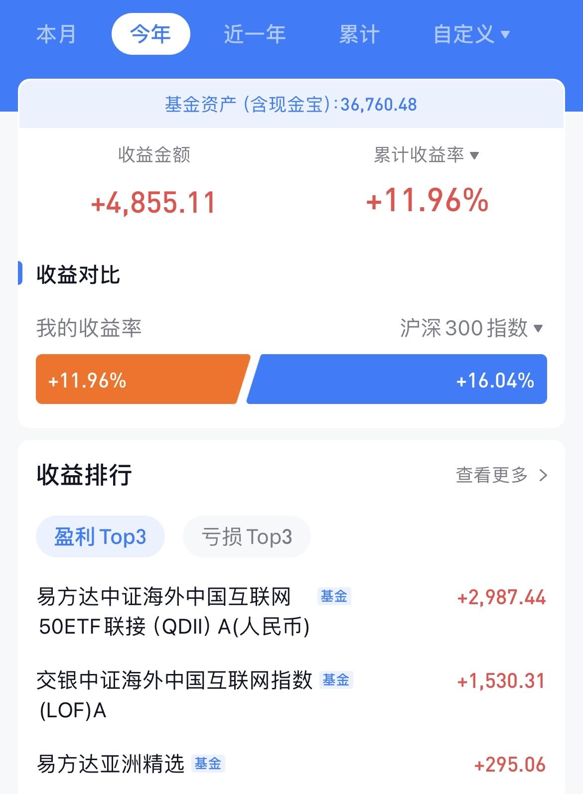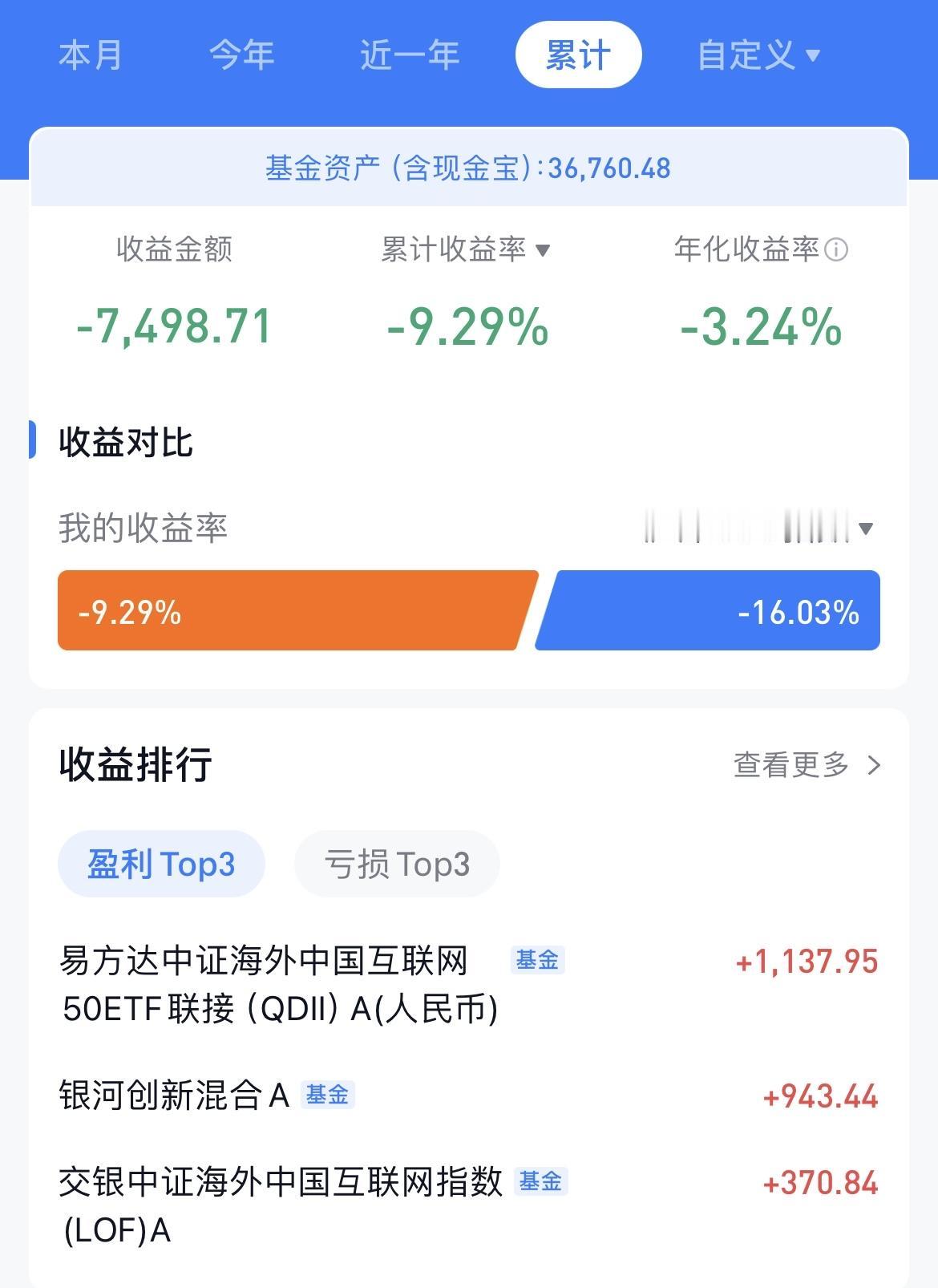 A 股“924 行情”到现在已经一周年了,我看了一下自己的账户收益情况,近一年收益金额 1.6 万,今年以来收益金额 4855 元,2021 年到现在累计收益金额-7498 元! 自从 2021 年开始买基金,折腾五年了,账户的总体收益还是亏损的,虽然近一年和今年以来收益都是正的,但有很大一部分都是之前套牢的基金回本了! 看着收益挺高,其实真正盈利的也没赚多少,反倒是之前亏损的大坑到现在还没有填满,到现在累计收益还是亏损的! 距离 924 行情刚刚好一年了,我还在努力弥补前期的亏损,大家都赚到钱了吗?