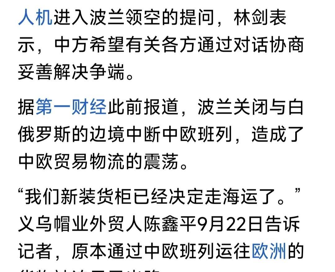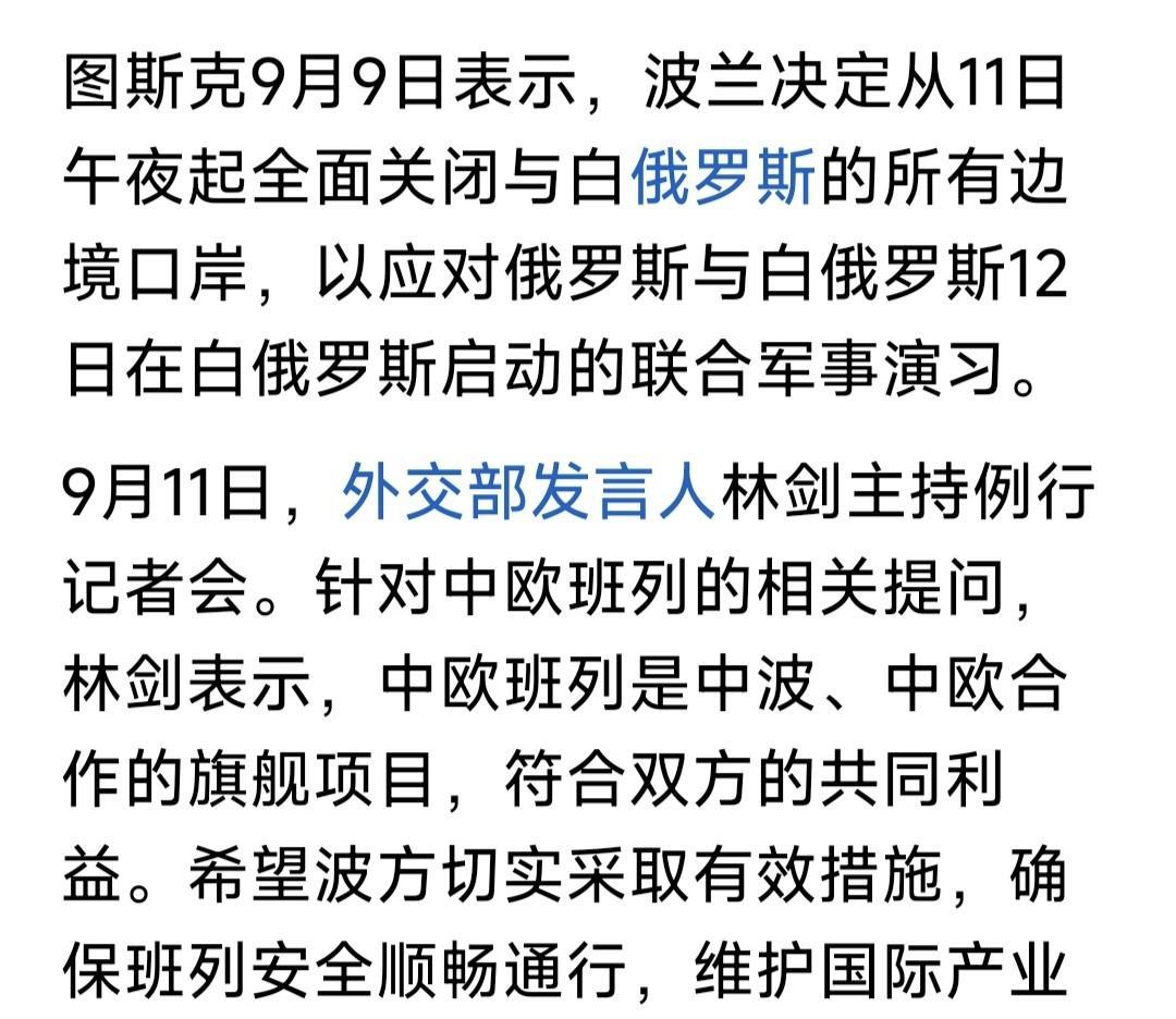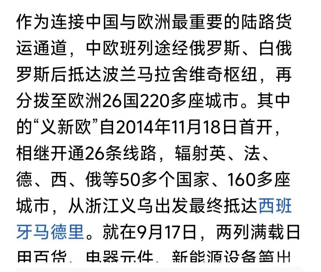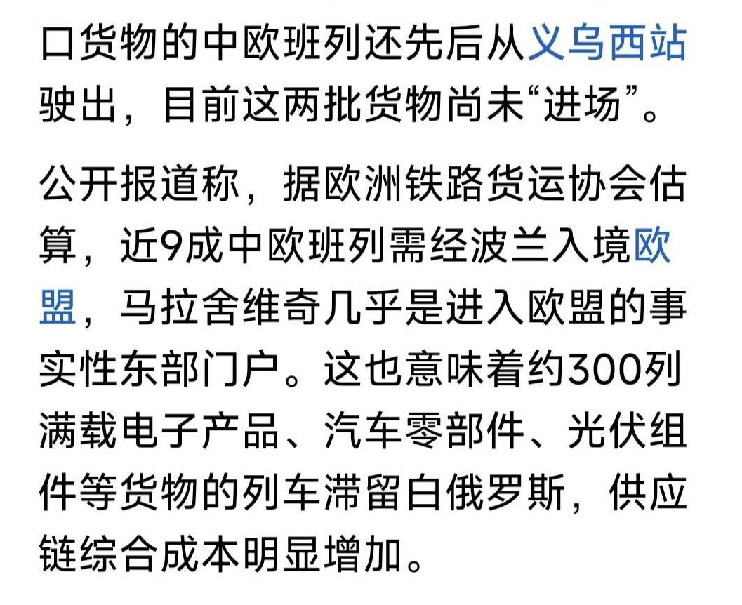 中欧班列波白通道,关闭十多天终于复通!这是一个好消息,既有利于中国,也有利于波白与欧洲各国利益。 中欧班列通道,是中欧经贸桥梁!覆盖欧洲25国,227个城市!亚洲11个国家100个城市,从中欧班列获益。 而中欧班列波白通道,是该班列“北中南”三条线中,里程最短速度最快,省时省力效益最好的“黄金”通道。 该通道是中国“一带一路”重要节点!自开通以来,承担中欧90%商品运输,是中欧经贸最重要互联通道,为中俄白波与欧洲经济互促,做出了贡献。 谁想到会有俄乌战争呢?谁想到会因这场战争,导致这条中欧班列大动脉中断呢?即便中断短短十多天,已使中企蒙受巨大损失!当然波欧不例外。 阻断之时,焦急之中,有些企业迫不得已,不得不改走南线,或绕道北极航运转运货物,费时费力成本暴涨,豆腐盘成肉价钱,还有什么利润可赚? 好在时间不长,经过中波及时沟通,俄白军演落下帷幕,波白通道终于重新开通!如此中企输欧产品,不用改道南线或绕道北极,效益就会好一些! 都是俄乌战争惹的祸!期望这场战争早点结束,俄乌两国停战和平,各自努力发展经济,惠顾民生,百姓安居乐业,人民生活幸福,比什么都好啊! …………