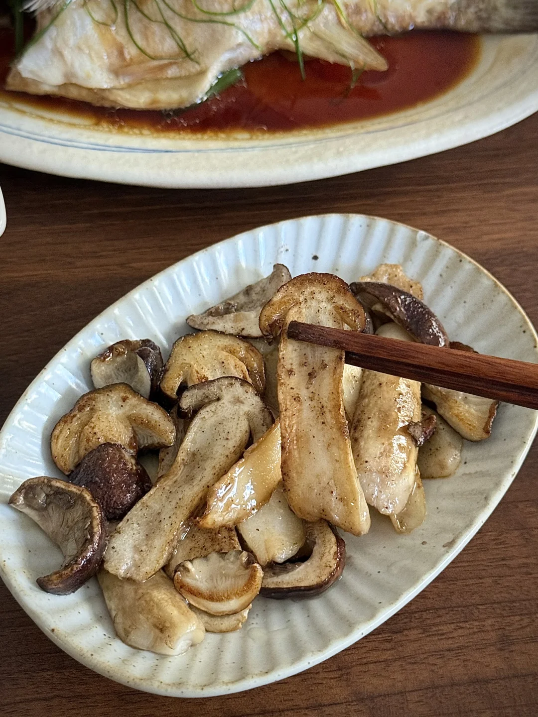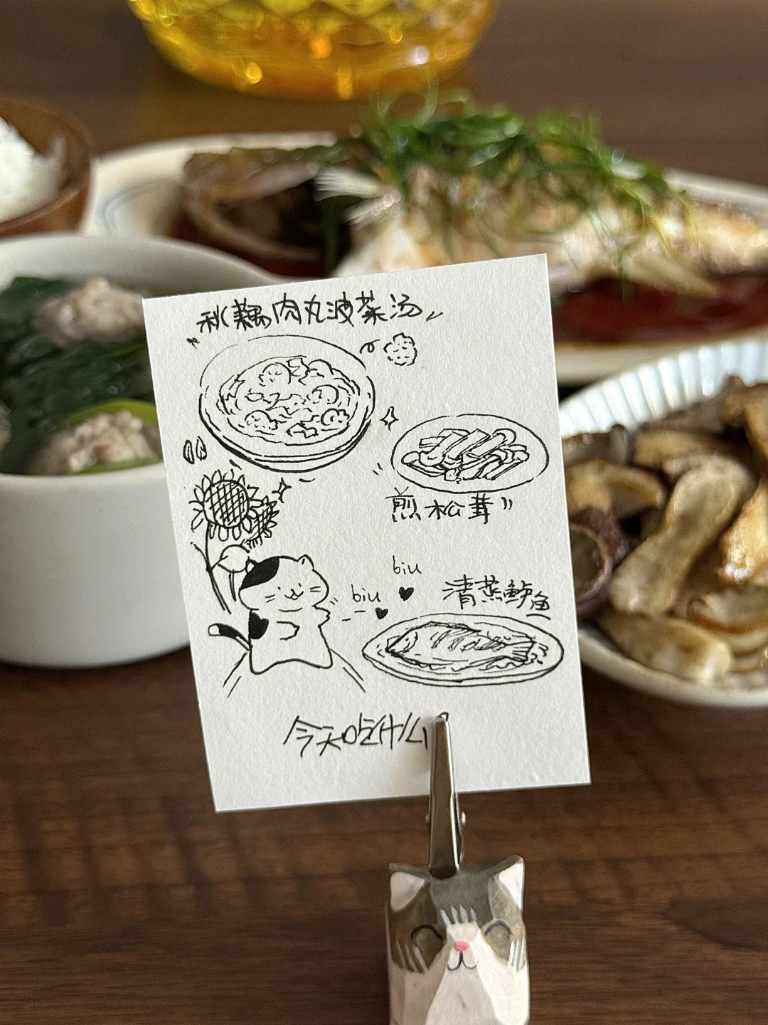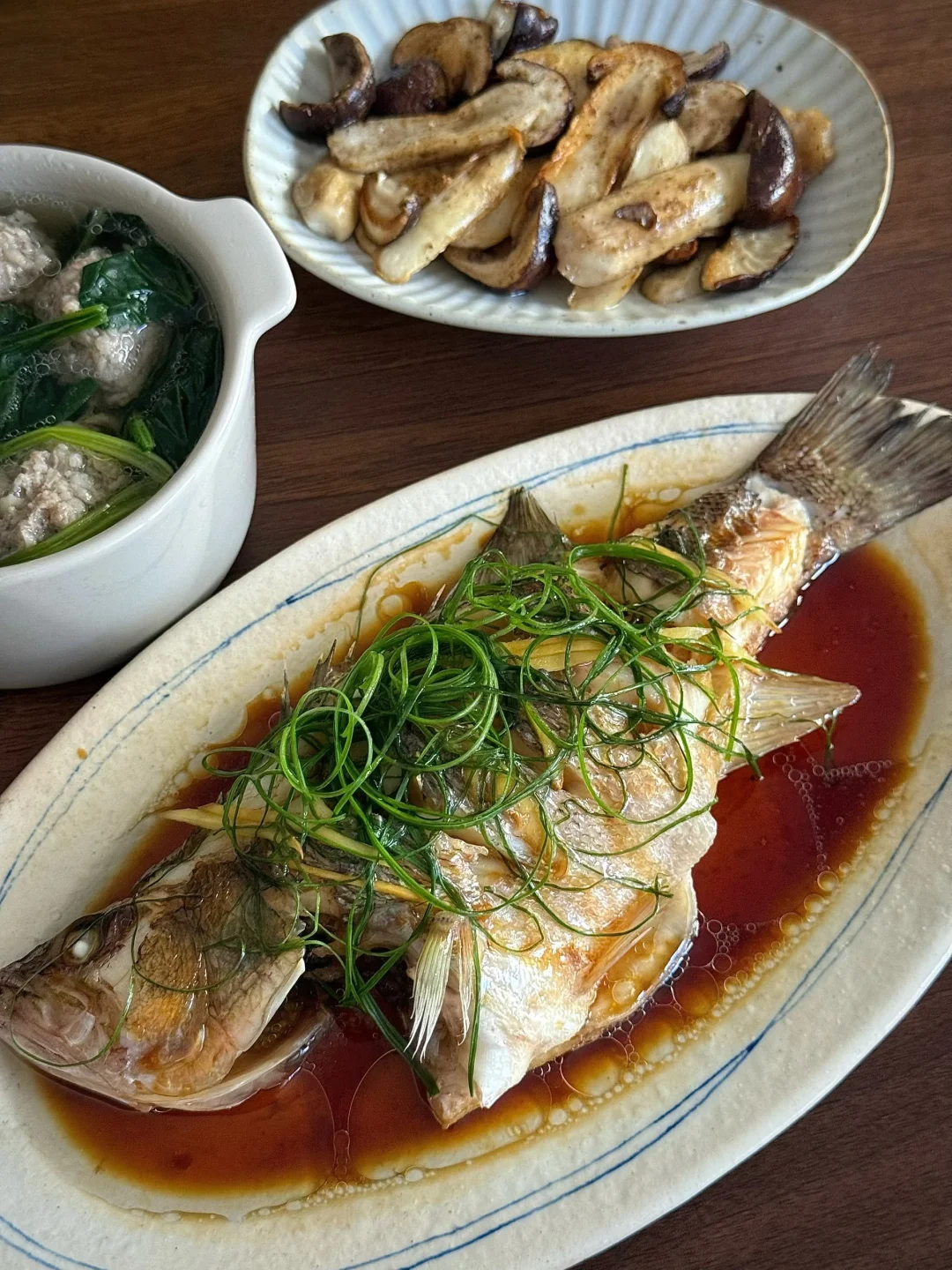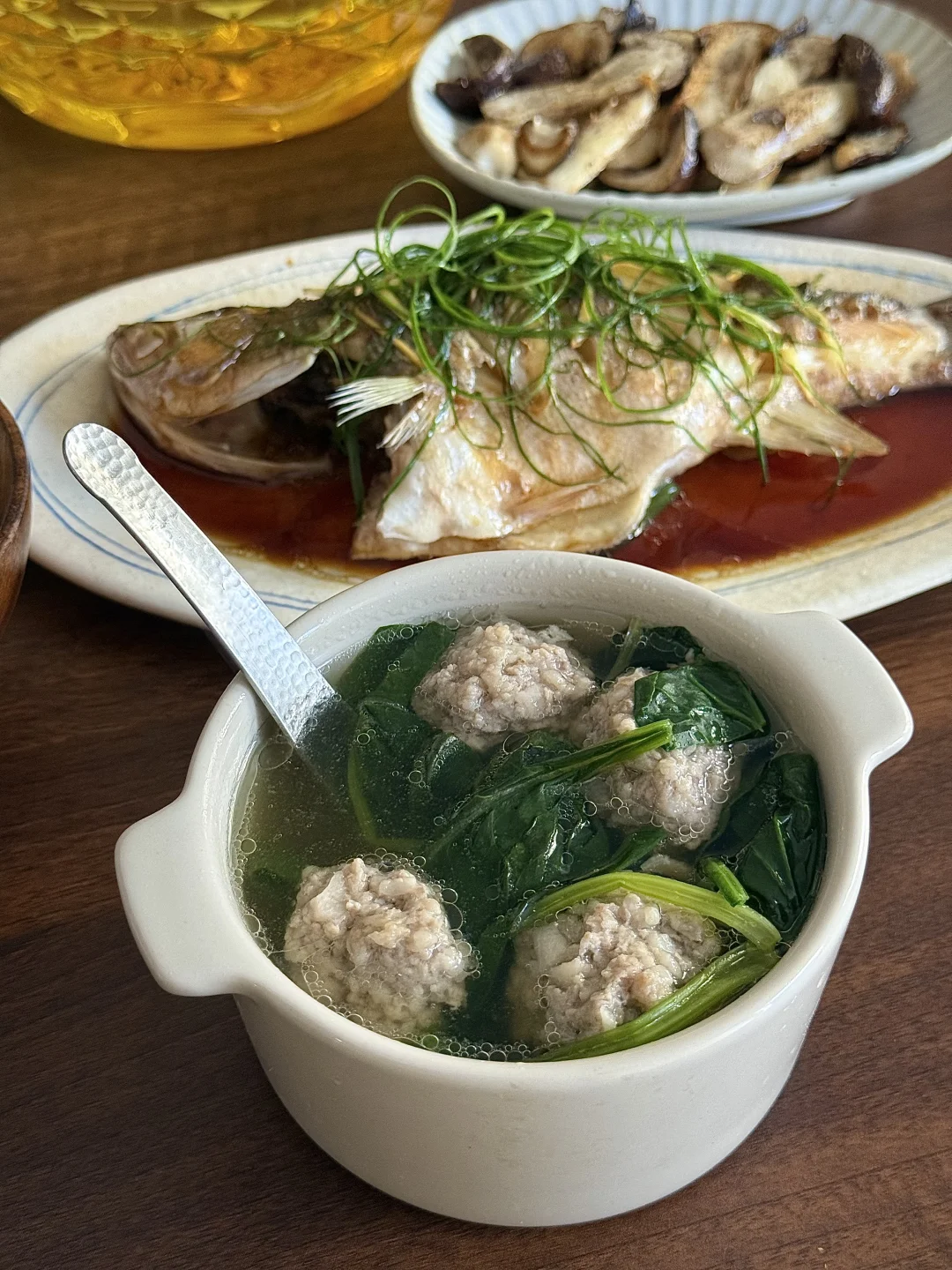 一人食的秋日午餐:清蒸鲈鱼、秋藕肉丸菠菜汤,煎松茸,再配上一碗米饭,简单却温暖。