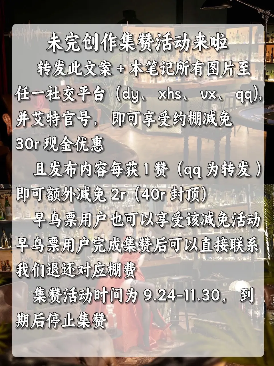 嘻嘻 谁来助力?转发此文案+本笔记所有图片至任一社交平台(dy、、vx、qq),并艾特官号,即可享受约棚减免30r现金优惠 且发布内容每获1赞(qq为转发)即可额外减免2r(40r封顶) 早鸟票用户也可以享受该减免活动,早鸟票用户完成集赞后可以直接联系我们退还对应棚费 集赞活动时间为9.24-11.30,到期后停止集赞