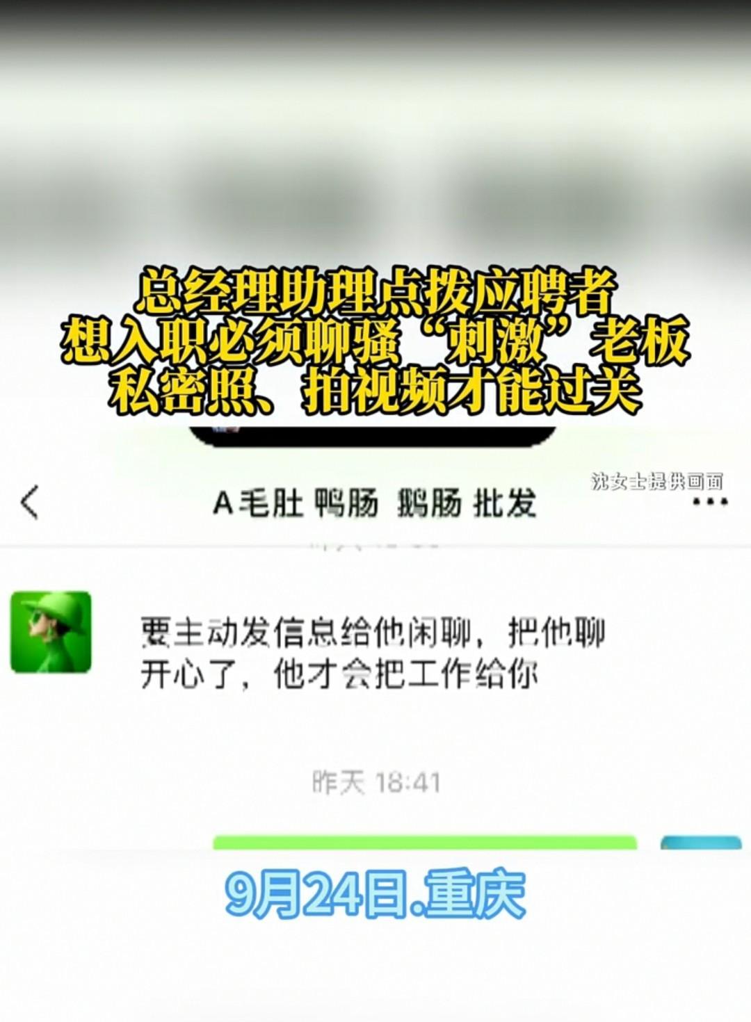 重庆,女子找工作,小助理传话给她,说你需要主动找老板聊天,把老板聊高兴了,工作就给你了,女子说那不是手到擒来的事情吗,我天生就会聊,小助理又告诉她,需要有一定深度,需要展示你妖娆身姿的那种,女子终于明白了,他们哪是面试呀,这不是在给自己寻找目标吗,结果带着记者就上门,想和老板好好聊聊,没想到对方反而不敢聊了,已经跑路了,网友猜测,小助理可能是老板的小号吧。 素材来源于:重庆天天630于9月24日报道。 沈女士长得漂亮,也善于沟通,她就想找那种与人交流的工作。 她看到有一家食品批发公司,是批发毛肚、鸭肠、鹅肠的,虽说听起来有点腥味,但开出的工资条件和自己选择工作的方向匹配,于是就报名了。 对方给她约定了面试时间,沈女士化好妆,穿戴好就来到了指定的地点。 面试的地点很大,可以容纳20多个女生同时面试。当时孙总非常随和,和大家谈笑风生,不像是高高在上的样子。 就这样,所有来面试的20几个女生都坐在里面,将孙总团团围住,孙总坐着开始面试,气氛相当好,一点都不紧张。 这种面试没有想象中那么封闭和紧张,反而是一团和气。 沈女士看到来的其他女生也面容姣好,年轻漂亮,心里还打起了鼓:自己是否有机会? 孙总也说了,这是初次面试,如果觉得你们其中有不错的,接下来自己的助理珊珊就会加你们。 到时候她会把工作需要的具体要求发给你们,如果你们能够胜任,那么就可以来上班。 沈女士觉得孙总为人和善,还是有点小期待珊珊姐姐能加自己。 她刚刚从公司走出来,手机就叮当一声,消息来了,是珊珊姐姐加自己了。 她迫不及待地点了同意,随后就盯着屏幕看,珊珊姐姐会发什么内容? 对方直截了当的说:“你的初试通过了,现在需要第二轮,如果你会聊天,那就没问题了。” 沈女士心想,我本来就是个话唠,咋不会聊天呢?并且我聊天还有一定深度,天南地北什么都能跟你聊,这一把我绝对能赢。 不过,屏幕当中突然闪现:“你要主动找孙总聊骚,把他高兴了,工资就给你了。” 沈女士很诧异,聊天就聊天,怎么变成了聊骚呢?想再次询问是不是字打错了。 还没等沈女士询问的时候,对方又发了信息:“你要刺激孙总五次,发一些私密照,拍一些视频,展示你妖娆的身材和你蠢蠢欲动的小心思。” 这下沈女士才明白了,这哪是毛肚、鸭肠、鹅肠批发招聘呀?这简直就是利用招聘的噱头,给自己物色目标。 要是真找不到工作,又急需用钱的女生,还真会上当的。 好在沈女士的品性与现有的情况,完全让她可以潇潇洒洒地给记者打电话,让他们把这种品行恶劣的孙总请出来谈两句。 结果去的时候大门已经紧闭,不知道对方是不是已经意识到了自己已经走到了末路,跑了。 她们马上又联系珊珊姐姐,可对方也把沈女士拉黑了。 后来问楼下物业的人,也说好久没看到人,这家公司确实是搞批发的。 沈女士面对镜头,希望女生们遇到这样的人,要勇敢地说不,不管是缺钱还是缺工作,这种人不可信。 我们人生的第一步可不能走错了,一定要和正能量、品行端正的老板共事才可以。 网友们怀疑这珊珊姐是不是孙总的小号呀?要不然哪个助理能够忍受得了孙总是这样的人?还能和他同流合污。 依据《民法典》第一千零一十条 ,违背他人意愿,以言语、文字、图像、肢体行为等方式对他人实施性骚扰的,受害人有权依法请求行为人承担民事责任。 孙总通过“珊珊”向面试的沈女士发送暗示文字,违背沈女士意愿,构成文字性骚扰。 沈女士作为受害人,可要求孙总承担停止侵害、赔礼道歉及赔偿精神损害等民事责任 对于此事,大家如何看?