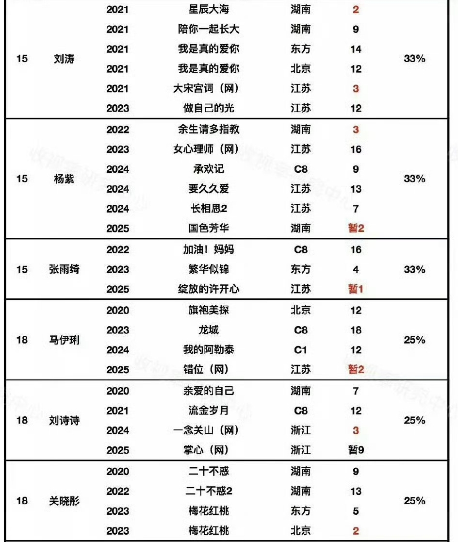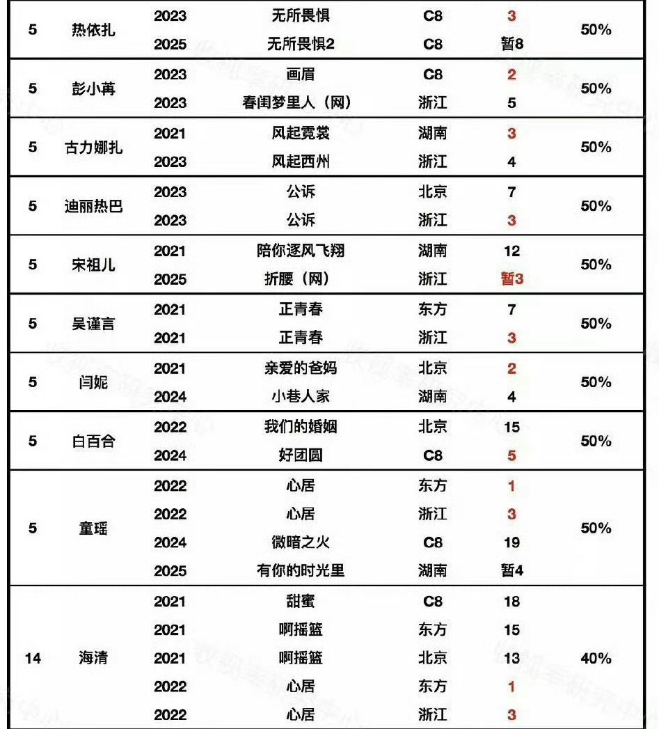 分别是赵丽颖和谭松韵,进入CVB时代之后,赵丽颖三部剧五台上星,全部年度收视前三,谭松韵四部剧2台全部收视前三,孙俪,周迅,热依扎分别是三四五名,央五卫三率都没到100%,但是央五卫三且集均5000万,且热度破万的剧,只有赵丽颖的《风吹半夏》和《与凤行》,都说自己女频第一不限题材,但是数据过硬的只有赵丽颖。