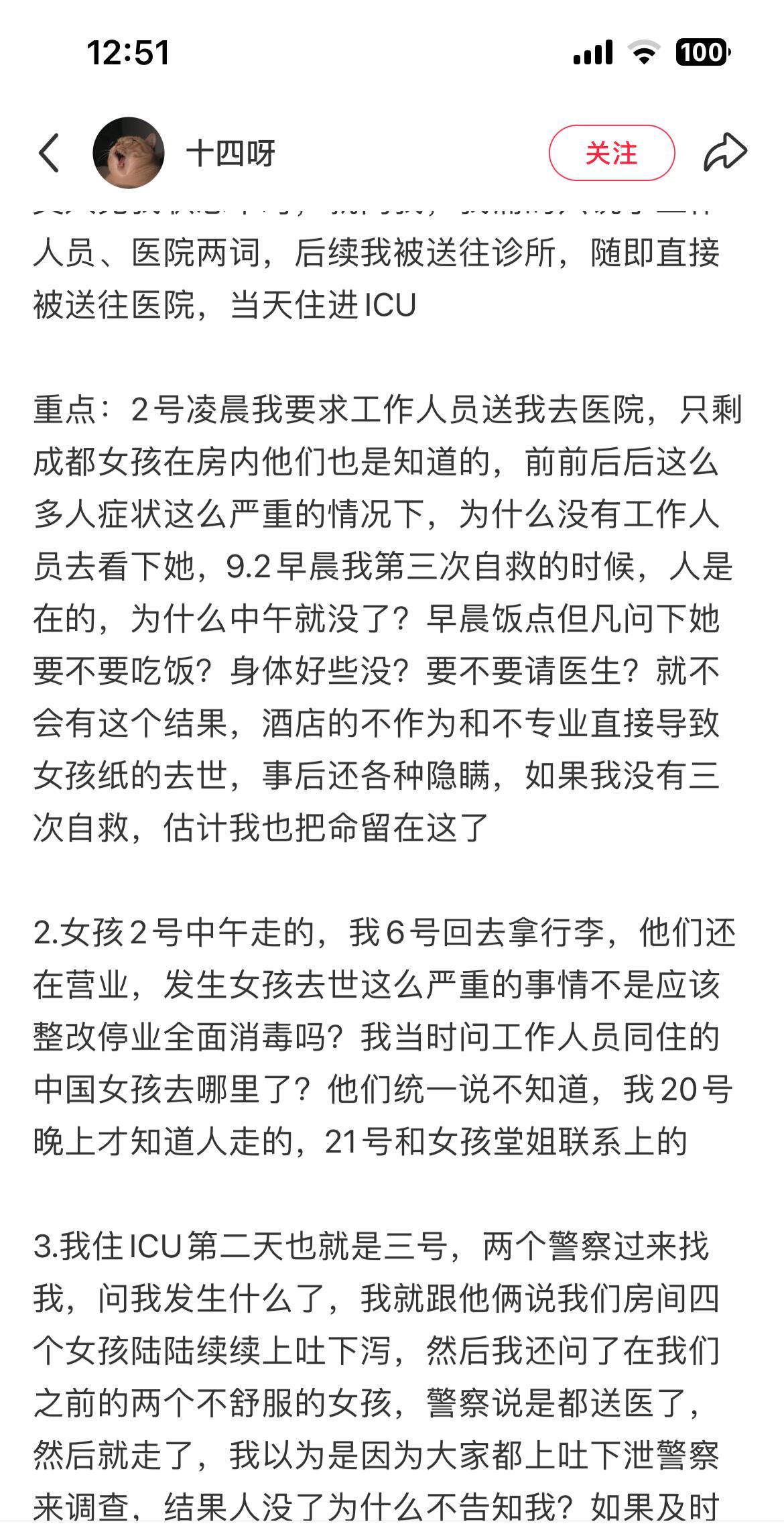 成都女孩在巴厘岛出事的事情上热搜后,她的室友站出来爆出更多内幕。这位女孩吃的饭很干净,根本看不出能造成这么严重的食物中毒。 让人揪心的是,每个人都知道第一时间要去医院,能动的都去医院了,都活下来了。这位成都女孩因为动不了,却没有任何一个人打120送她去一下,导致悲剧的发生。 真的是以血泪教训提醒普通人去这种不发达国家,最好吃住都要顶级的。#巴厘岛事故#