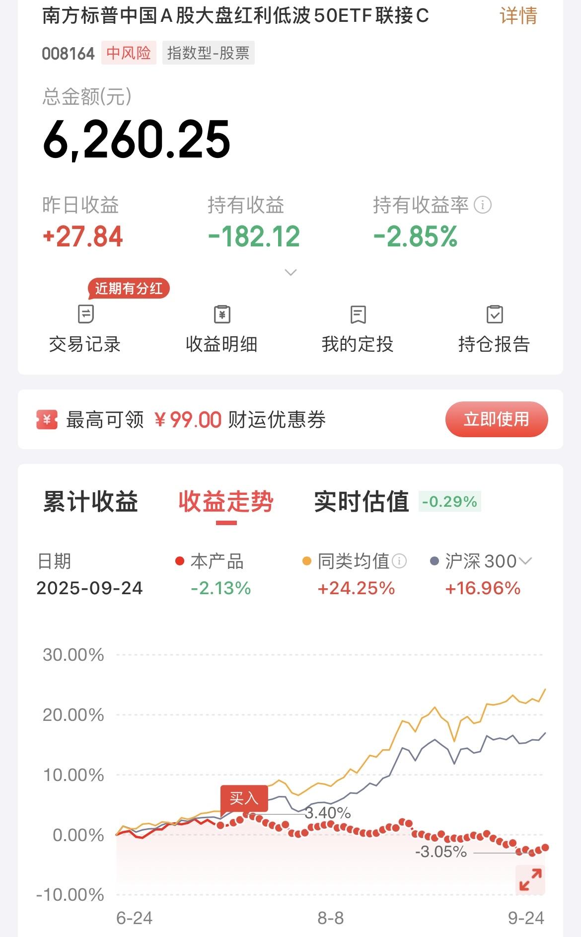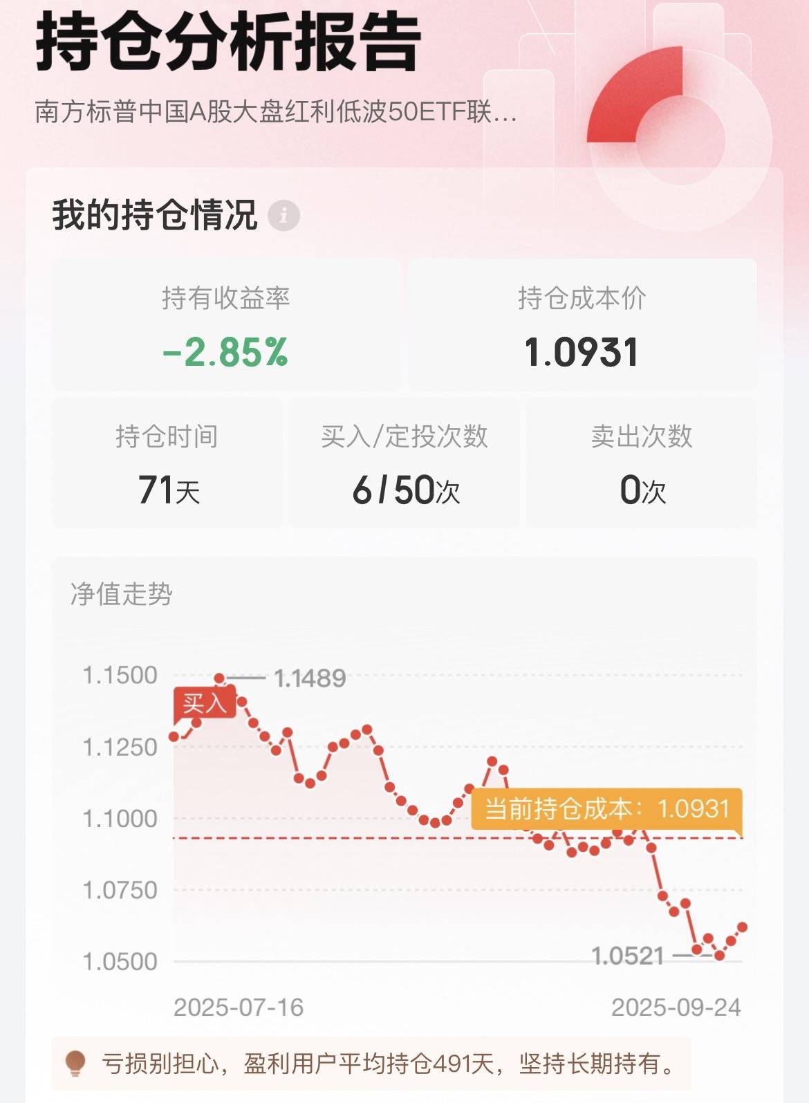 7 月份的时候,我决定每天 50 元,开始定投南方标普红利低波 50 基金,两个月过去了,有网友留言问是否还在继续定投? 我当然还是在继续定投的,其实设置好了自动定投,保证资金充足,剩下的交给时间就行了! 从 7 月中旬以来到现在已经过去 2 个月了,除了定投 50 次,我还手动补仓了 5 次,目前累计投入 6200 多元。 只不过不幸赶上最近红利低波基金下行,目前收益率还是亏 3 个点! 既然是决定的事情,肯定是要坚持下去的,定投最核心的逻辑就是时间和行动! 现在才刚刚过去 2 个月,我计划是投资1 年,还有 10 个月,谁也不知道 1 年后将是什么结果,一起期待吧!