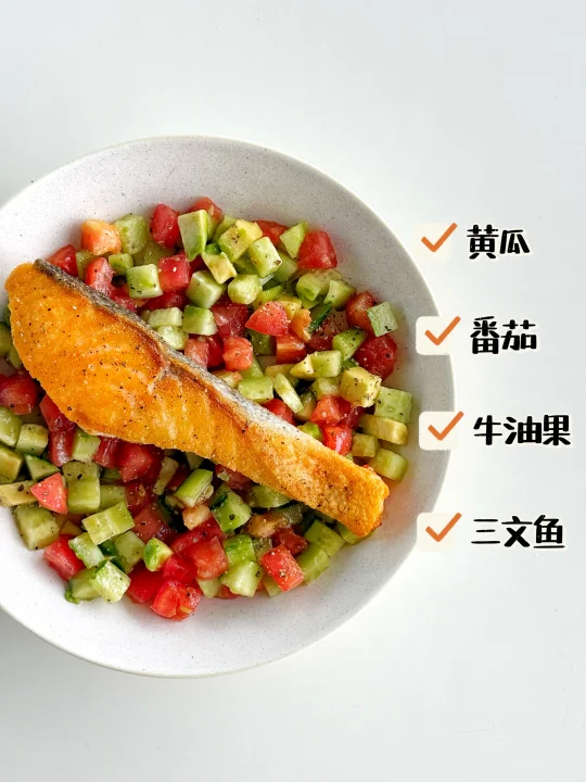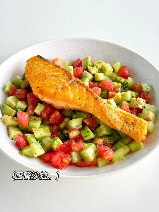 👍煎到外焦里嫩的三文鱼,搭配上绵密的牛油果🥑、清甜的黄瓜🥒和多汁的番茄🍅,大喊一声:balance!口感层次超丰富,又是一款无主食的正餐沙拉🥗,好吃不胖❗️
