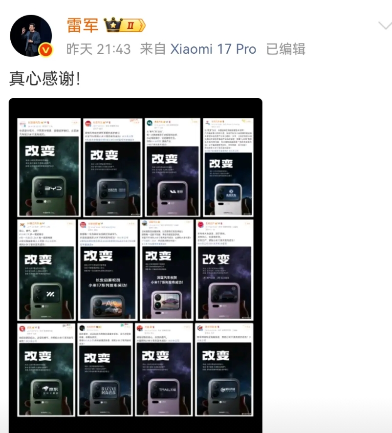 雷军昨天的最新微博动态,虽然只有短短四个字:“真心感谢!”,但他配图妙啊,把友军的微博助力截图放一块。