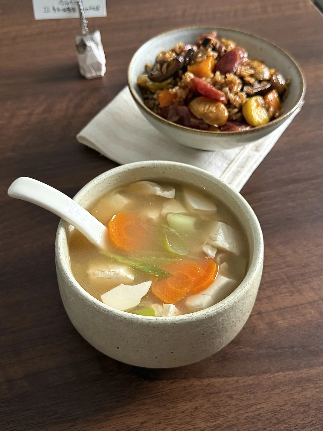今日午餐:板栗腊肠焖饭,豆腐味增汤