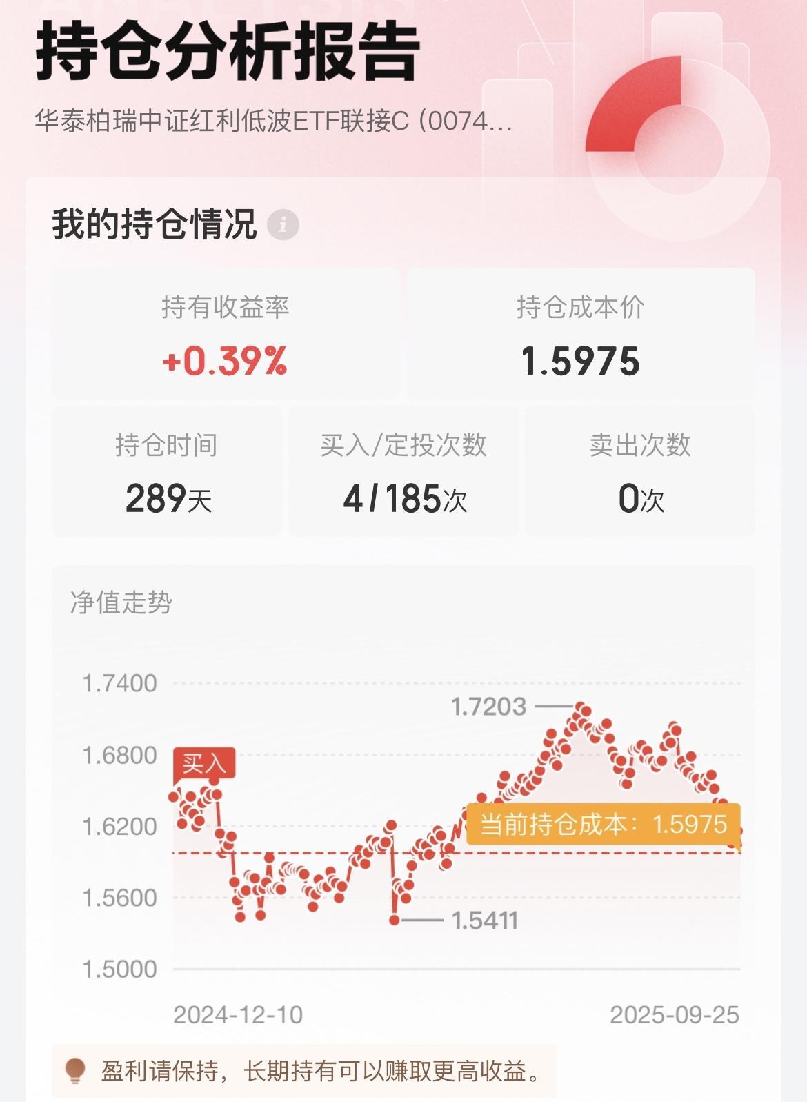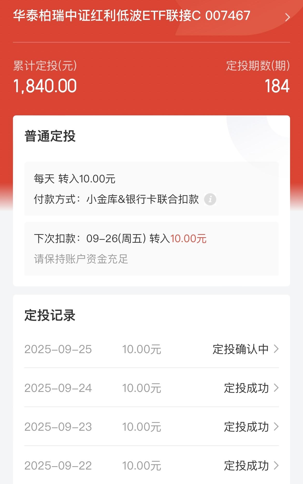 从去年 12 月份开始,每天拿出 10 元,定投华泰柏瑞中证红利低波,到现在已经坚持 10 个月了,计划是定投 5 年,收益怎样了? 累计定投了 184 期,投入了 2000 多元了,目前微微盈利! 红利低波基金最近回撤有点大,近一个月下跌了 5.59%,把前期赚取的收益全部回吐! 最主要的原因还是科技股太猛了,现在资金都流向了科技赛道里,像红利基金这种高息股,短期内也不会有太大的行情,所以被抽水很正常! 但从长期来看,配置红利基金,可以作为防御板块,无论是牛市还是熊市,红利基金的回撤都不会很大,特别适合新手入门投资! 我的“10 元定投策略”依然会继续下去的,还有 2 个月就迎来一周年了,也算走完了五分之一的路程! 投资基金就是这样,与时间为伴,但求付出,静待花开!