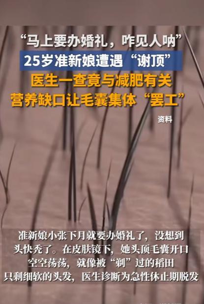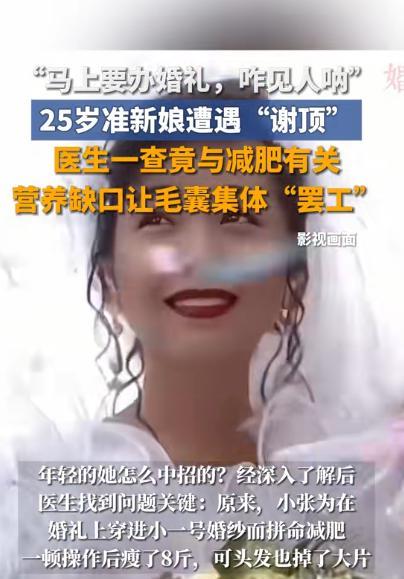 “这下后悔了吧!”近日,浙江杭州,一25岁的女孩马上就要结婚了,为了能穿上小一号的婚纱,她疯狂节食健身减肥,结果自己的头发开始疯狂掉落,马上就要结婚的她已经几乎快要变成“秃头”!网友:变瘦和秃顶只能选一个啊。 据荆楚网9月21日报道,一名25岁的女子为了能够在结婚当天穿上漂亮的婚纱,于是就开始减肥,哪曾想她这一减肥的举动竟差点使自己的头发全部都掉完了。 小丽(化名)在试婚纱的时候试了很多都不是特别满意,然而就在他苦恼的时候,突然看到了一条很有仙气的婚纱,随后就让销售人员给它取下来试了一下,不料她穿上这个婚纱有一点点紧。 但由于这个婚纱是她最喜欢的,所以她就决定要在下个月结婚之前瘦下来,只为能够在婚礼现场美美的。回家之后,小丽在网上搜了各种减肥的食谱随后给自己制定了一套减肥方案。 每天中午她只吃一半的碳水,晚上什么也不吃,而且还要多加一个小时的高强度运动,对于这样高强度的运动,她有好几次都想放弃。但当她想起婚纱的时候,就又像打鸡血了似的,咬着牙坚持了了下去,令她没想到的是效果很显著直接瘦了8斤。 虽然身上的肉掉了下来,但这时候小丽又面临了一个问题,她头发开始大把大把的往下掉。看着头发一点点的变稀疏,小丽内心十分害怕,于是就赶紧去了医院。 到医院之后经过医生的检查,发现小丽之所以会出现这样的情况,是因为身体里面的营养太少了,所以导致它的毛囊出现了问题,长时间的营养缺失又使内分泌紊乱等多种情况,最后导致头发大把大把的往下掉。 听到这之后,小丽很害怕到举办婚礼的时候,头发还没有好转,于是就赶紧问医生有没有什么快速治疗的方法,不料医生却告诉他,如果想要头发快点有好转的话就必须每天保证足够的睡眠以及每天足量蛋白质的摄入。 小丽虽然为了能够穿上好看的婚纱减肥成功了,但是在这同时她也付出了惨重的代价,所以通过这件事情告诉我们,如果想减肥的话,必须严格按照健康营养的食谱来,不然就会出现像小丽这样的情况。 那么对于这件事情,你还有什么看法呢?