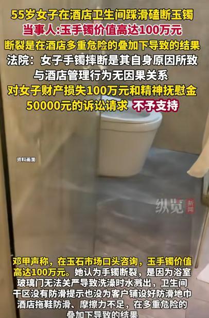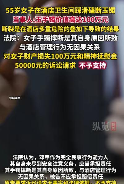 “白嫖还有理了?”2025年1月,云南腾冲,一女子入住酒店,洗完澡后去卫生间拿东西,结果因地面有水,导致她脚下踩滑,意外磕碎了手上的玉镯子。女子去玉石市场询价,被告知镯子值100万,便要求酒店赔偿100万元。法院:无需赔偿! 据纵览新闻9月23日报道,一名女子在住酒店期间,因为不小心滑倒把自己价值100万的玉镯给磕碎了,她便把酒店告上了法庭,不料法院的审判结果让她大吃一惊。 事情的起因是在一月份的时候,王女士(化名)带着自己的女儿来到了腾冲旅游,那天她们早早的就入住了酒店,到酒店之后王女士就先洗了澡,洗完澡换好衣服之后,她就穿着酒店的一次性拖鞋出了浴室。 然而就在她刚出来的时候,女儿说需要棉签,她就又返回浴室里面拿棉签,不料王女士刚走到卫生间的时候,因为刚洗过澡地面上有很多水不小心将它滑倒了。在滑倒的时候,她本能地伸出左手,自然地攥住了浴室门的把手。 不料就这样一个保护的举动不小心将她左手上面的玉镯给磕成两半了,王女士看到自己价值100万的玉镯被磕坏了之后很是心疼,一气之下就直接去找了酒店的管理人员,说自己的手镯之所以会成这样,是因为酒店提供的拖鞋不放滑。 而且浴室的门不够紧闭导致卫生间里面也有水,等多种原因所以她才滑倒的,并要求酒店赔偿她,酒店管理人员听了之后觉得这一切行为都是王女士的不小心而造成的,表明不会作出任何赔偿。 王女士听了之后很是生气,于是就直接以赔偿玉镯100万以及将学费5000元为由,将酒店告上了法庭。 随后经过法院调查取证,觉得王女士已经不是小孩了,而且明知道洗过澡之后的卫生间地面有水滑,还穿着一次性拖鞋进去所以与酒店的设施以及管理没有任何的关系,最终法院酒店不用作出任何赔偿。 很快这件事情就被网友刷到了,有一些网友看了之后在下面留言调侃说,但凡王女士的请求成功的话,所有的酒店将会通通关闭,还有一些网友在下面说,王女士简直是异想天开,自己行为的过错休想让酒店承担责任。 那么通过王女士这一事情也提醒了我们在洗完澡在进浴室的时候一定要谨慎小心以免滑倒,那么对此你还有什么想说的吗?