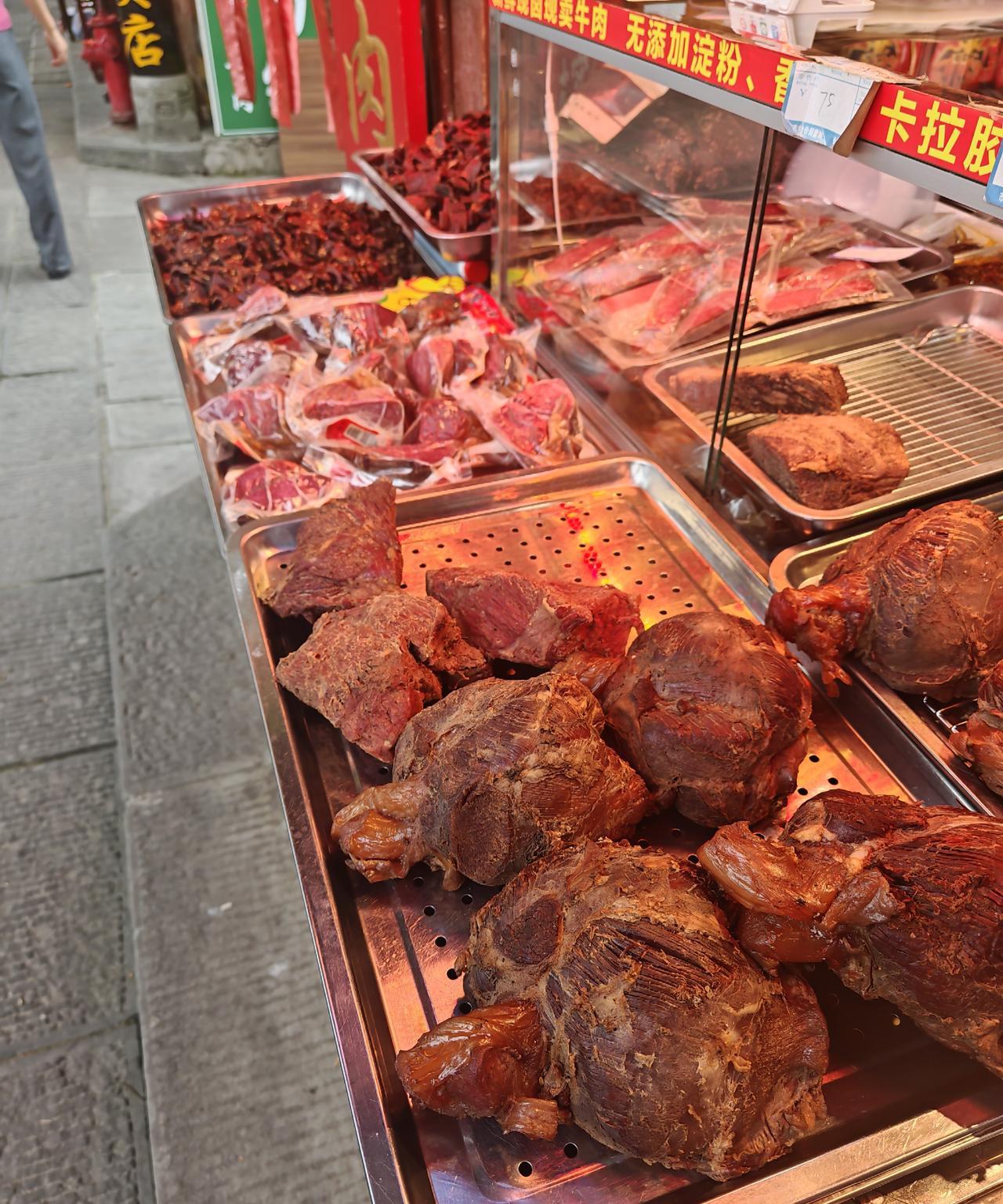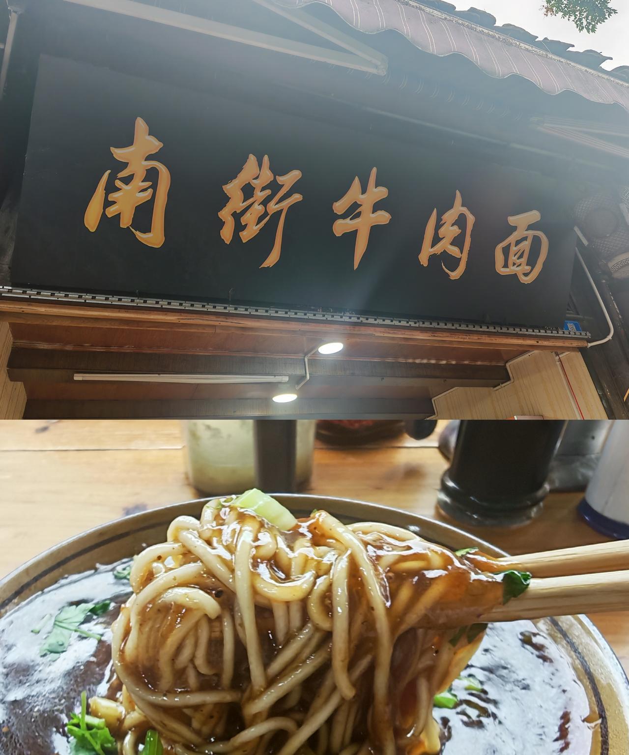 下午1点40的高铁回绵阳,快过节了,也该回家了。 今天上午是在阆中古城的最后半天,没什么事,就是晃晃悠悠的转,吃点美食,拍点打卡照。 民宿老板推荐的南街牛肉面,她说他们家的牛肉面味道不错,价格也地道。7元一两,再往古城里走就要15元一碗了。 好吧,就按照民宿老板推荐的,去品尝品尝。 味道不错,牛肉面里还有香菇和豆芽,就是牛肉有点咸。 吃完牛肉面,再去打卡“阆中”大字墙,自拍杆拍几张,记录一下,现在看起来没什么,再过20年、30年是不是很感慨。 古城的美食也不少,这里最有特色的肯定的张飞牛肉、保宁醋、白糖蒸馍、手工麻饼、川北凉粉等等。 整个古城免费,但很多小景点都要收费的,这也是目前中国古镇的惯例。 例如:想上中天楼、华光楼,得15元,还有地质博物馆、风水博物馆、皮影博物馆等等。 可以买通票,100元,60岁以上老人免费。 可以走到华光楼,去看看华光码头,这里晚上可以坐船看夜景,60元一位,40分钟。 走累了,随便找个门面外面的竹凳子,和老板聊聊天,噜噜猫,逗逗小狗,也不错。 在阆中古城住了2天,最喜欢晚上在古城里转悠,熙熙攘攘的游客,灯火通明的街道,道路两旁飘扬的五星红旗,微风不燥的晚风,真的是舒服得板。 #晒图笔记大赛#