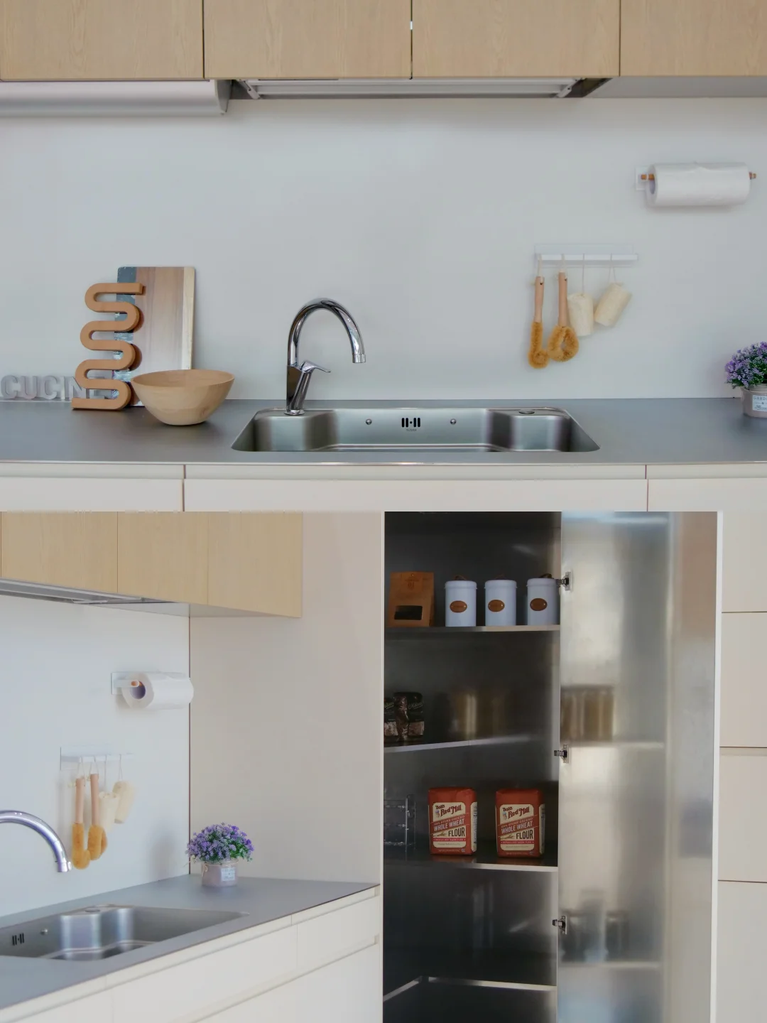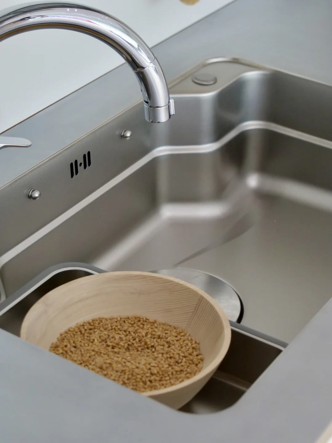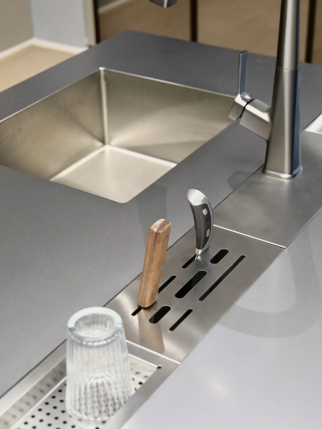 不锈钢台面和不锈钢水槽都是一体无缝焊接的,避免藏污纳垢开胶脱落。全柜采用食品级304不锈钢,无甲醛困扰,不怕娃爬进柜子啃啃咬咬,守护家人健康。