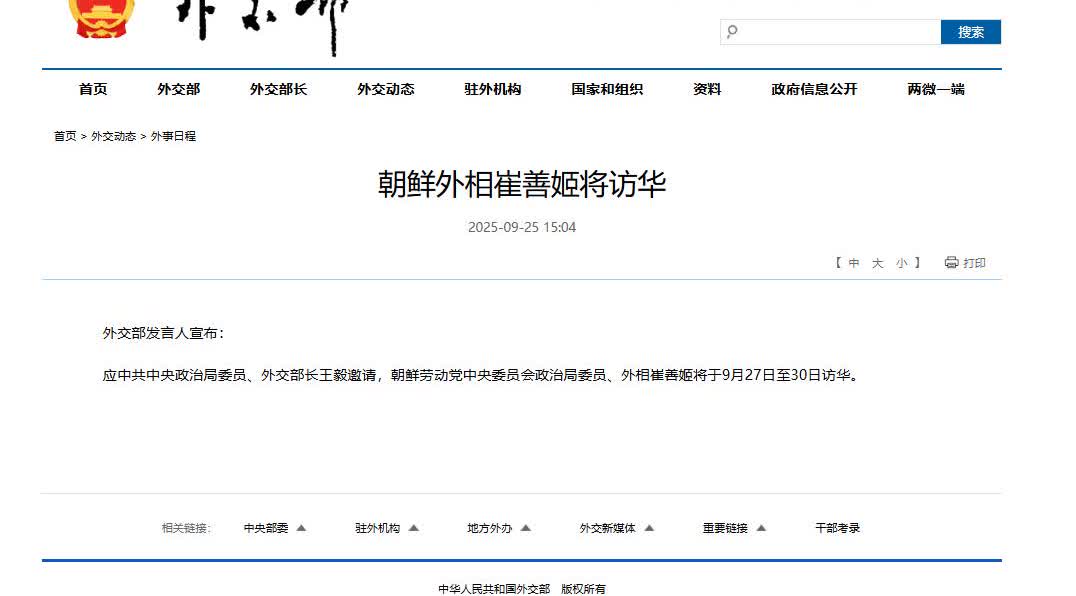 一个月两度访华,朝鲜外相又来中国了,传递了什么信号? 9月25日,我国外交部发言人宣布,应外交部长王毅邀请,朝鲜外相崔善姬将于9月27日至30日访华。 这已经是她一个月内第二次来中国了,结合月初金正恩刚带着女儿访华的背景,这密集的互动里藏着的信号其实很明确。 首先要指出的是,这种高频次高层往来绝对不是偶然。想想看,月初金正恩刚出席完抗战胜利80周年活动,中方就明确表态“维护中朝关系是战略方针”,现在外长紧跟着再来,显然是要把高层共识落到实处。 现在两国合作早不是停留在口头,30万吨粮食、北斗导航服务这些实打实的支持都在推进,崔善姬这趟很可能是敲定后续细节。 其次就是应对东北亚的复杂局势。 这边中朝互动升温,那边美日韩刚搞完联合军演,韩国总统李在明还公开说,“中俄朝走近会让韩国难做”。 在这种阵营对峙的苗头下,崔善姬两度访华就是在释放明确信号:中朝的战略协作是稳定的。 就像中方此前在贺电里说的,这关系是“定海神针”,能直接牵制美日韩的军事动作。 综合这些来看,朝鲜外相的这趟访问很务实。 朝鲜要搞经济建设,中国能提供技术和资金;中国需要区域稳定,朝鲜是重要一环。 之前罗先港合作、农业机械援助都证明了这种互补性,崔善姬现在过来,说不定会谈更多民生领域的合作落地。 说到底,一个月两次访华,既是中朝“血盟关系”的现实体现,也是应对地区博弈的战略动作。在美日韩不断强化同盟的当下,中朝用密集互动划出了维护东北亚稳定的底线。