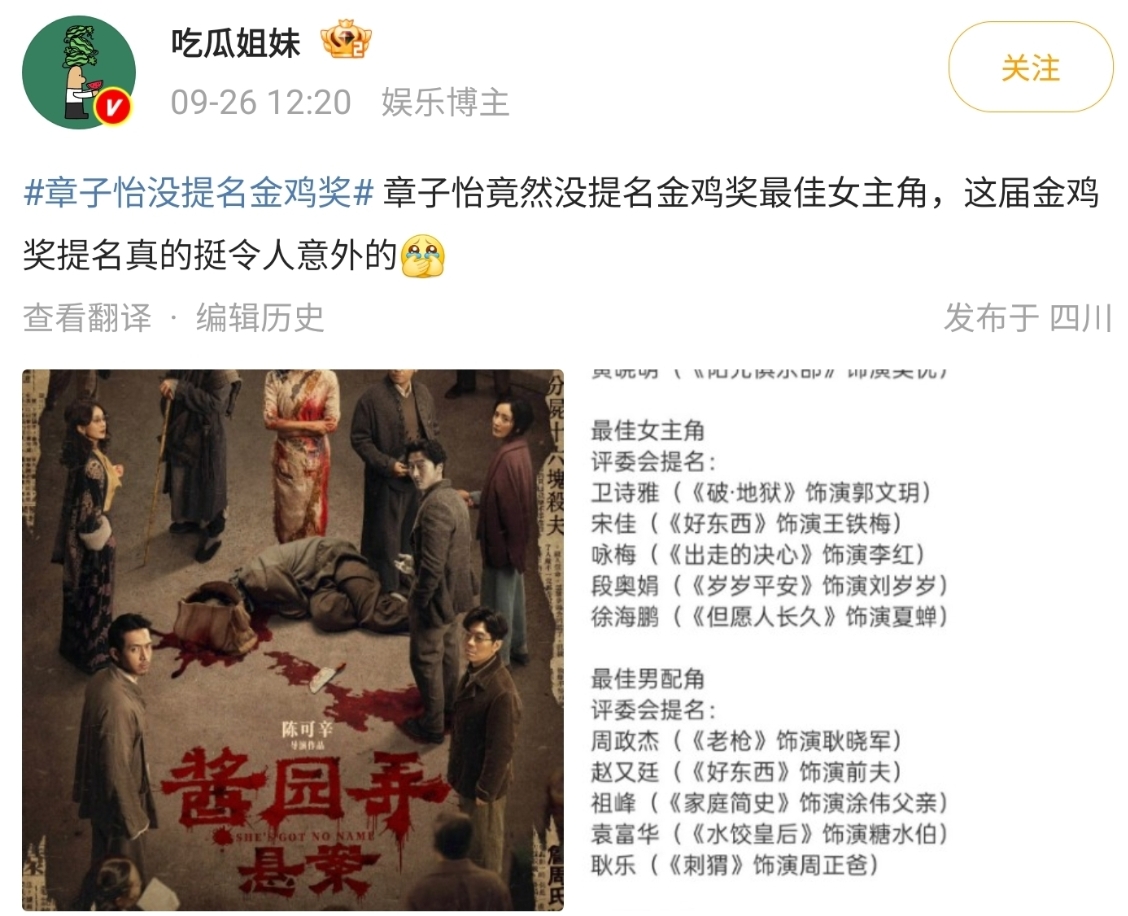 大家都看好你,偏偏你最不争气。 金鸡奖提名没有酱园弄,成了很多媒体博主的遗憾。