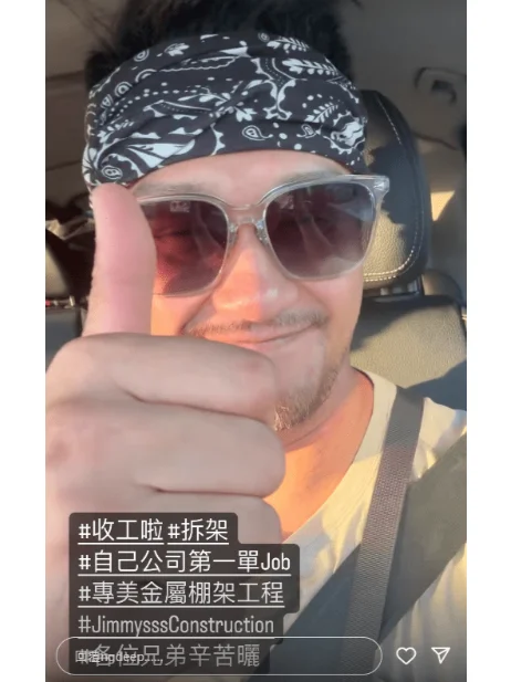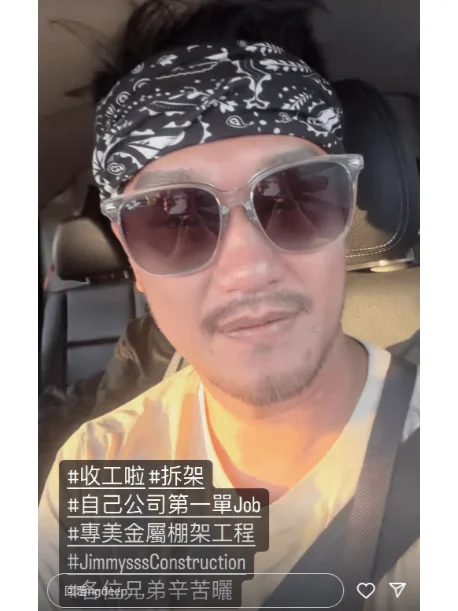 吴浩康前日在限时动态贴视频,并加话题表明:“收工啦 拆架 自己公司第一单Job 專美金屬棚架工程 各位兄弟辛苦晒 ”晒黑了不少的吴浩康,唇上和下巴都留了胡子,他戴上头巾及太阳眼镜遮掩倦容,但太阳眼镜下仍看到有一双很大的眼袋,不过他不忘对着镜头高举拇指点赞。