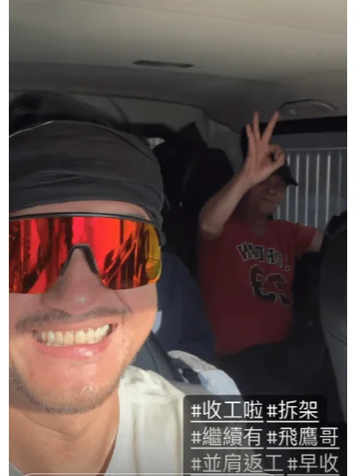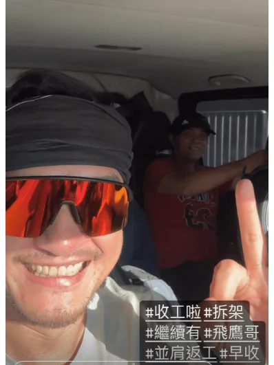 及后吴浩康再于限时动态发帖,他写上:“收工啦 拆架 继续有 飛鷹哥 並肩返工 早收 ”吴浩康晒到满脸通红,更握着拳头兴奋地说:“收工啦!”而“搭架界林峯”亦配合老板笑着做出OK手势。
