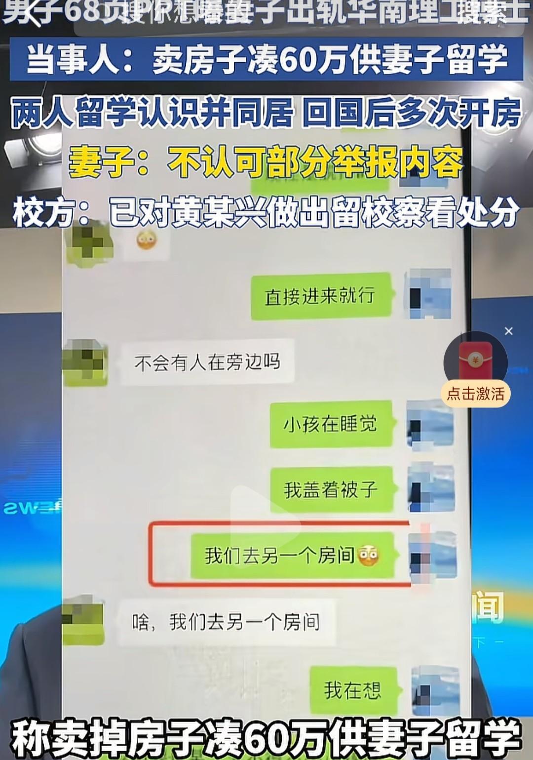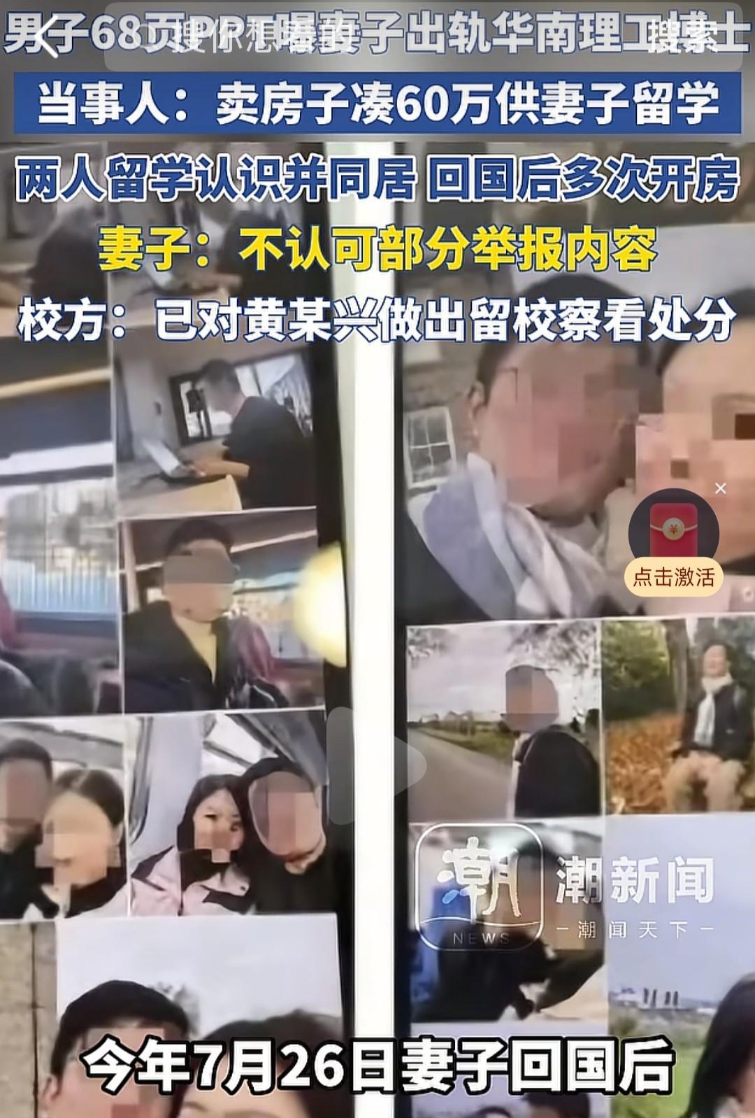 举报人称,2024年7月,自己卖掉婚前的房子凑60万送妻子到英国留学,妻子去后一个月就结识了华南理工大学公派留学生黄某兴,很快两人就同居了,以老公老婆相称。 真是淫荡的疯狂,4岁的女儿在家,两人商量去隔壁房间做,甚至相约在小区门口。 当事人妻子不认可部分举报内容,称房子是两人婚前合伙买的,丈夫侵犯了她的隐私。 黄某兴还未毕业,已被华南理工大学作出留校察看的处分。 当事人已决定离婚,希望法律为他讨回公道,作为过错方,女的应该少分或不分财产,还得赔偿精神损失费,孩子的抚养费也肯定不能给女的,三观不正又怎能教育好孩子。