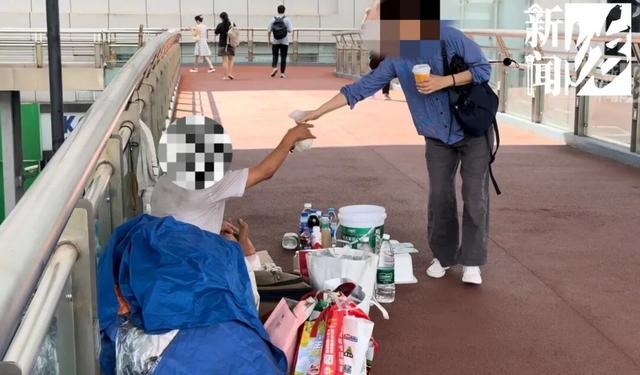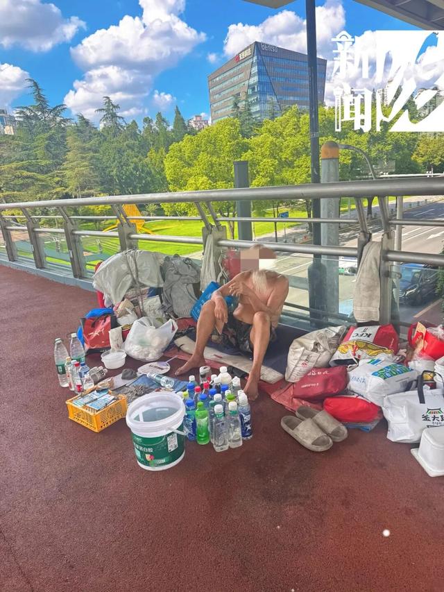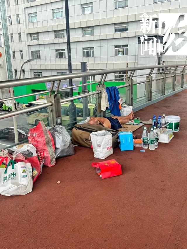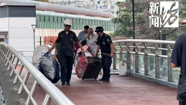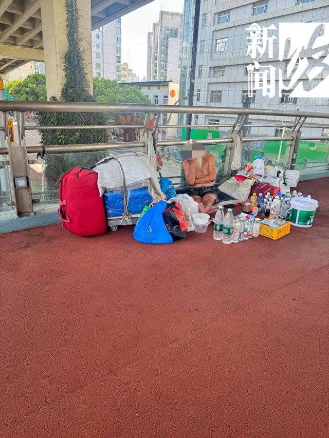 每天巡查看到这个情况,我们城管和下面的协管员,就把他从这里劝离,为了保证人行天桥的畅通,但他经常回来的,他就是喜欢这里。