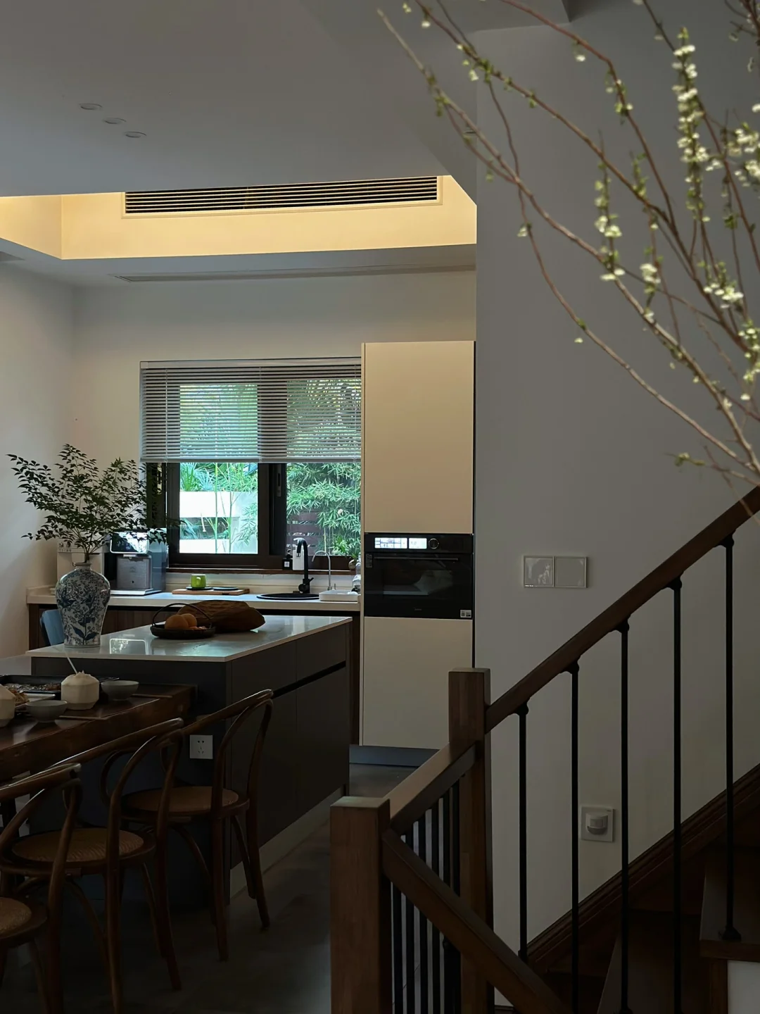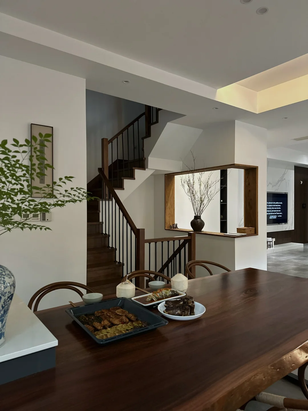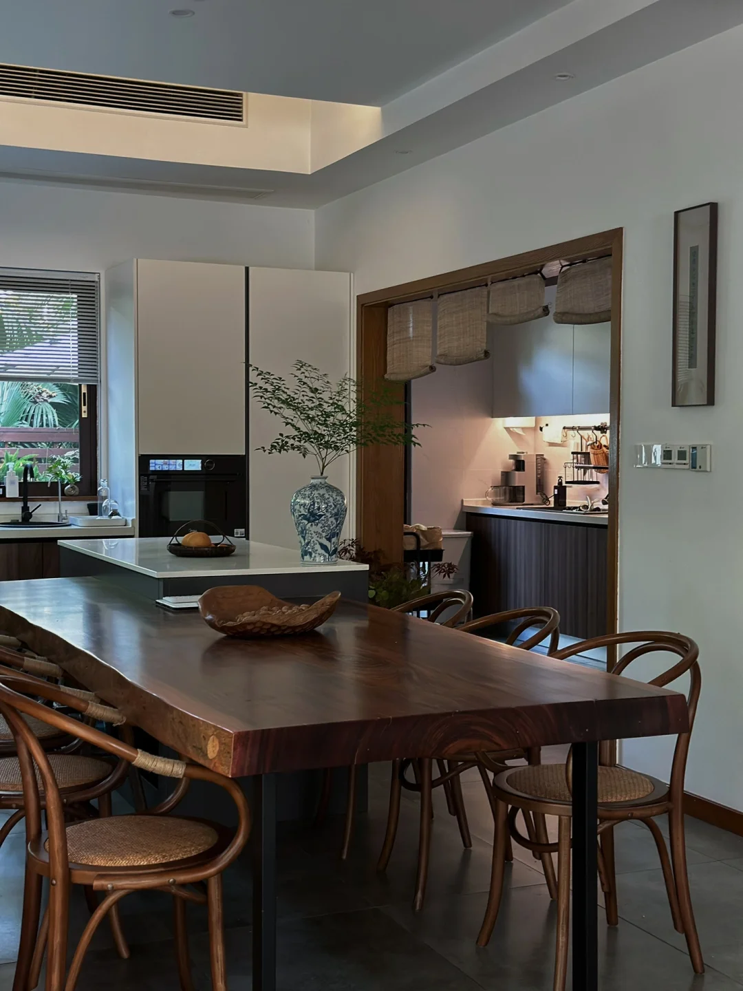 向居家新趋势靠拢,餐、客、厨打通融为一体就是很好的改变。传统中式给人刻板、严肃的感觉,家当然要以放松为主。餐厅不只用来吃饭,餐桌岛台一体,融入西厨,与家人一起度过美好烧烤、面食、咖啡时光。