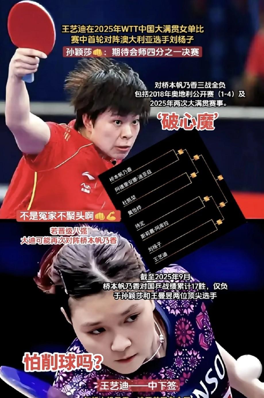 [灵光一闪][灵光一闪]万众期待!WTT中国大满贯28号开赛,中午11点由莎莎打头阵,对阵日本平野美宇!国乒队全天比赛单双打,总共有14场比赛! 桥本帆乃香在莎莎半区,首轮迎战迪亚兹,如果不出意外,大迪第三轮将会第三次迎战桥本凡乃香! 希望大迪能加把劲,打破心魔,会师莎莎!! 只要有除了世一世二以外的其他主力能破桥,就会有希望把桥本这种势头给摁住!要不今年的亚锦团体赛和混团真不好打! WTT中国大满贯国乒队加油!!加油!![加油][加油]