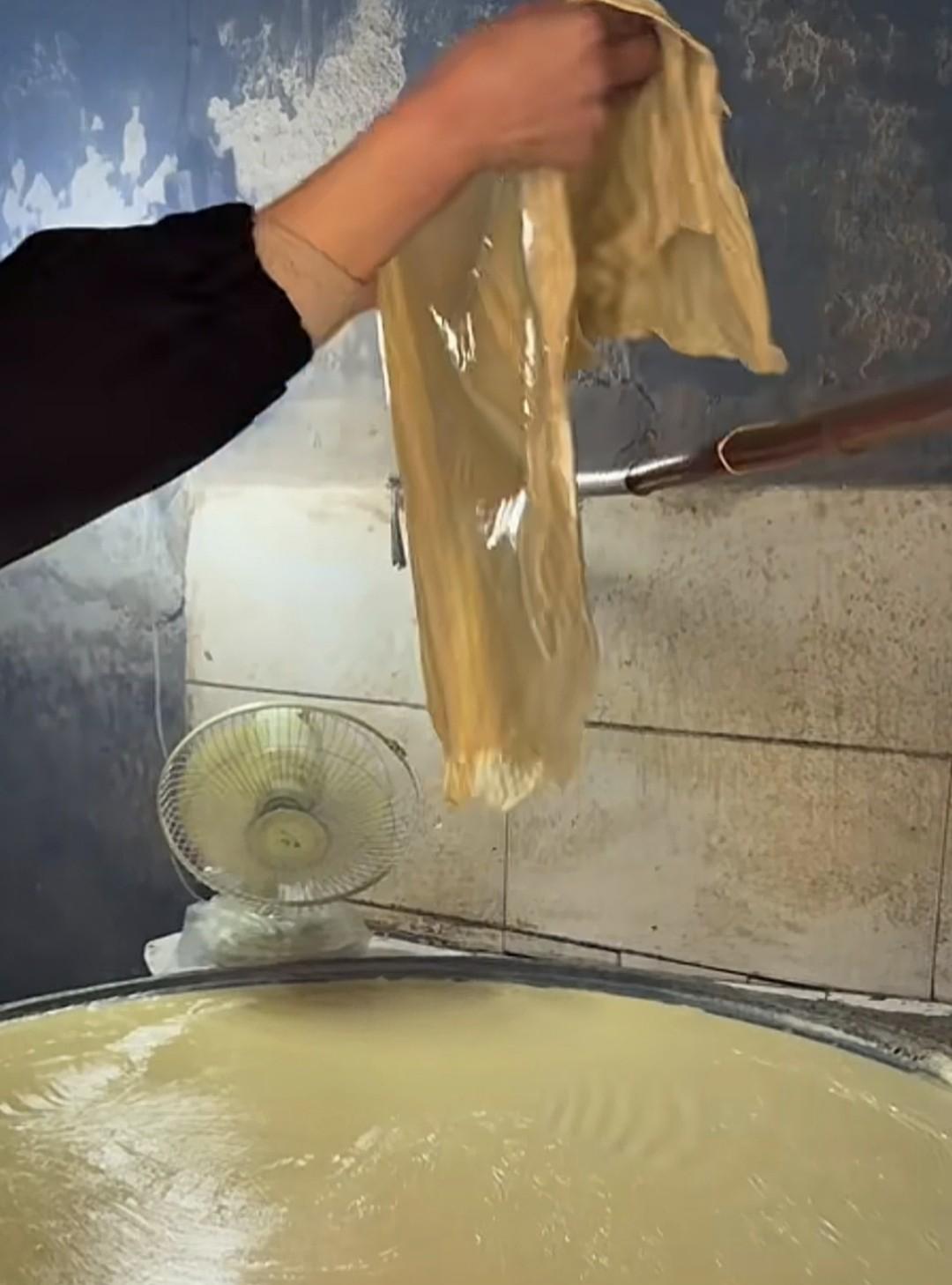 原来李富贵卖的豆腐不是她自己做的 据她所说整个工艺过程她只是给师傅打下手 特别是给豆浆点卤水那一步靠的是经验,目前她还没熟练掌握。他们先是凌晨3点把浸泡好的黄豆用电动磨磨成豆浆,并在煮豆浆的过程中留取一定数量的豆皮晾干,然后请经验丰富的老师傅点卤水,使得豆浆变成豆花。最后把豆花倒入垫有纱布的模具中静压一个半小时,如此一来新鲜的豆腐就做成了。整个过程需要好几个小时,大部分时间她都是给做豆腐的师傅做助手,待豆腐成型了天也亮了,她就开上她的小货车,开启一天的下乡卖货之行。#手工做豆腐# #豆腐制作技艺# #豆腐制作流程#