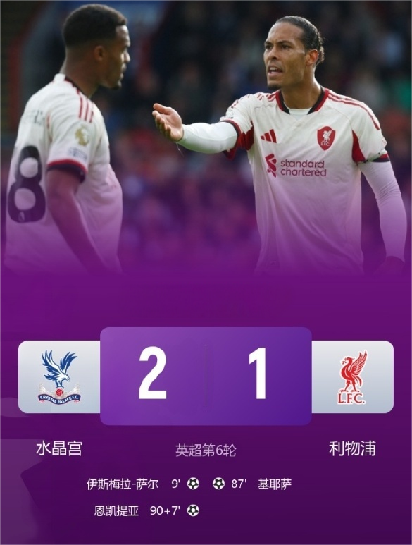 英超第6轮,水晶宫2比1绝杀利物浦,利物浦赛季首败,水晶宫保持不败+18场赛事不败