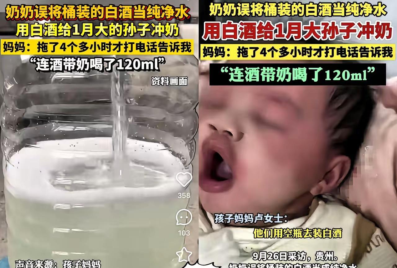 近日,贵州一位奶奶,误将桶装的白酒当成纯净水,给刚一个月大的孙子冲奶粉,连洒带奶一共120mL,宝宝喝完4个小时才告诉宝妈。 看完这个图片,感到这位奶奶是故意的。一般人都知道,给宝宝冲奶粉,用的是50度左右的温开水,怎么会用矿泉水呢?矿泉水太凉了,根本冲不开奶粉。再说了,即使用矿泉水,当你打开矿泉水那一刻,白酒的味道很明显,满屋子的酒味,怎么会闻不见呢? 这奶奶如果真不知道宝宝喝的是酒?那宝宝喝一口会难受,难咽下去的时候,奶奶没有看看宝宝的表情,大人喝酒还咽着难受,何况是宝宝,当宝宝喝一口时,就应该发现奶粉不对劲,为啥不停止食用?为啥还让宝宝喝120m乚? 这个奶奶的做法不能原谅,更不能理解奶奶的行为,奶奶有什么目的?这个只有奶奶自己心里清楚! 朋友们,你们对这位奶奶怎么看?欢迎您在评论区留言! 声明(图片来源于网络,侵权联系删除)