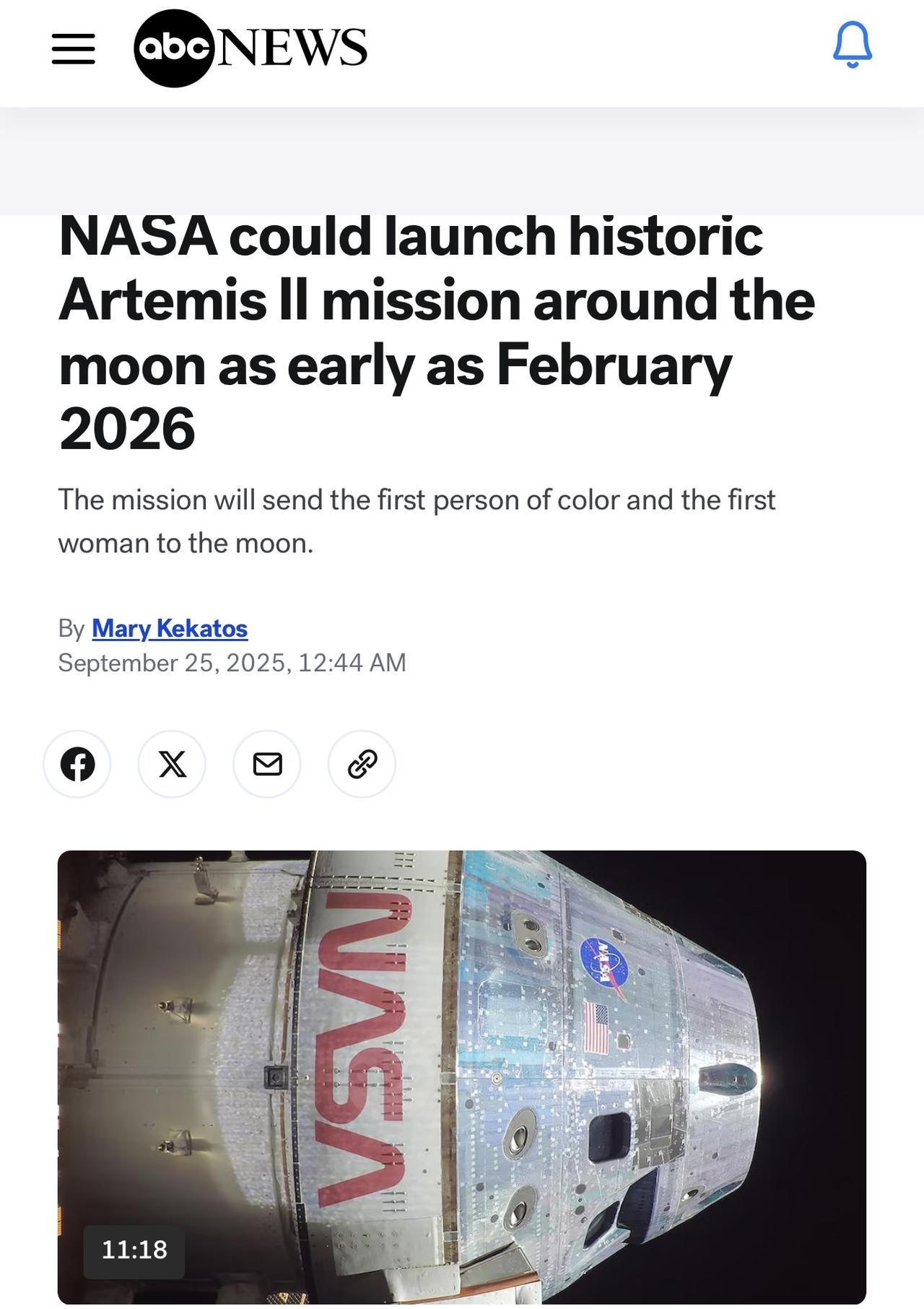 美国宇航局NASA可能于2026年2月启动阿尔忒弥斯二号任务,这将是5