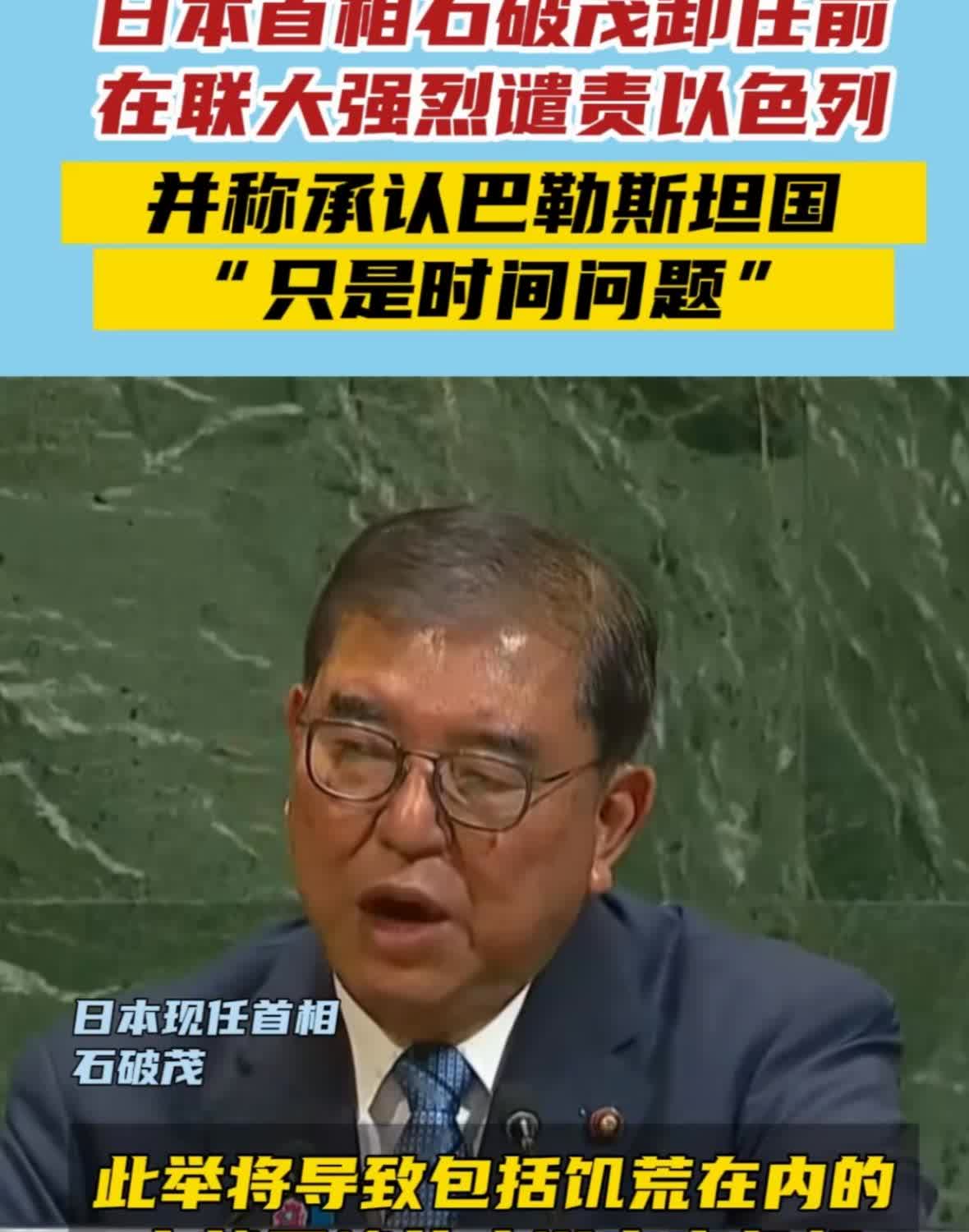 日本首相石破茂在联合大会上对以色列总理内塔尼亚胡之前发表关于不允许巴勒斯坦建国的言论进行强烈谴责,并称:“承认巴勒斯坦国只是时间问题,现阶段承认巴勒斯坦国不利于目前的中东局势,但不是日本的最终决定”,石破茂同时谴责以色列在加沙制造的人道主义危机,并警告以色列适可而止,不要加剧中东的人道主义危机,要尽快结束中东的所有军事行动,避免局势进一步恶化