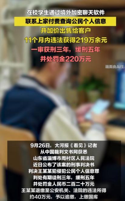 是个人才!山东淄博,一学生在上网时发现“商机”,通过境外的聊天软件,联系上家付费查询他人身份信息,并加价来卖给客户,从中赚取差价,11个月内竟获利219万元,事情败露后,他就被警方依法逮捕,法院这样判了! 据豫视频9月25日报道一名男子在境外聊天软件上面上演了一场中间商赚差价的戏码,随后被警方发现之后,立马将他逮捕。 事情的起因是小孙(化名)还是一名在校的大学生,在学校闲着没事干的时候,他就经常会浏览一些境外的网站,然而那天他偶然间看到了一条消息,有人愿意出高价来盗取别人的信息。 看到这之后小孙立马就钻研了起来,后来发现顾客想要的信息可以通过购买的渠道向商家购买,这样一来它可以通过加价的方式再卖给所需要的顾客,在中间就可以狠狠的捞一笔差价。 于是他立马就干了起来,小孙以真诚以及价格优惠为筹码,吸引了很多老顾客在他这儿购买,所以他仅仅只用了11个月的时间,就违法获得了31万余个虚拟数字货币,折合下来,人民币高达219万余元。 小孙本以为自己会在这条道路上赚很多钱,不料很快就被网警给发现了这件事情的匿端,随后小孙被抓捕之后,这件事情也被法院接受过来处理。 随后经过法院的调查以及小孙自己的自述之后,法院觉得这件事情虽然触犯了公民的个人权益,但鉴于小孙主动承认起来给他们提供线索,所以最后适当的会减轻一些对他的惩罚。 最后法院判决小孙被判处有期徒刑三年,缓刑5年违法所得的210万元全部应上缴国库。 很多网友看了这件事情之后,在下面评论说,小孙胆子也太大了,人还在国内竟然就能干出这样的事情被抓就是早晚的问题。还有一些网友在下面小肯说干这种事情竟这么挣钱,自己也要去干。 不管怎么样调侃归调侃, 面对像小孙这样的行为属于违法行为,所以我们大家一定要引以为戒,跨越法律红线的事情一定不要做。对此你还有什么想说的吗?