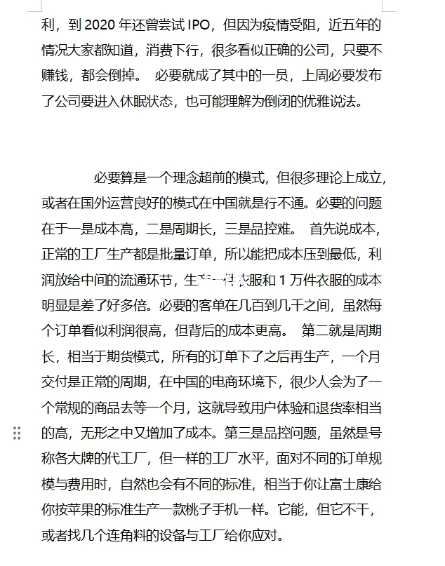 必要建立之初,也曾得到很多认同,因为模式颠覆,老板有资历又懂商业,融资顺利,虽然小众,但发展还算顺利,到2020年还曾尝试IPO,但因为疫情受阻,近五年的情况大家都知道,消费下行,很多看似正确的公司,只要不赚钱,都会倒掉。 必要就成了其中的一员,上周必要发布了公司要进入休眠状态,也可能理解为倒闭的优雅说法。