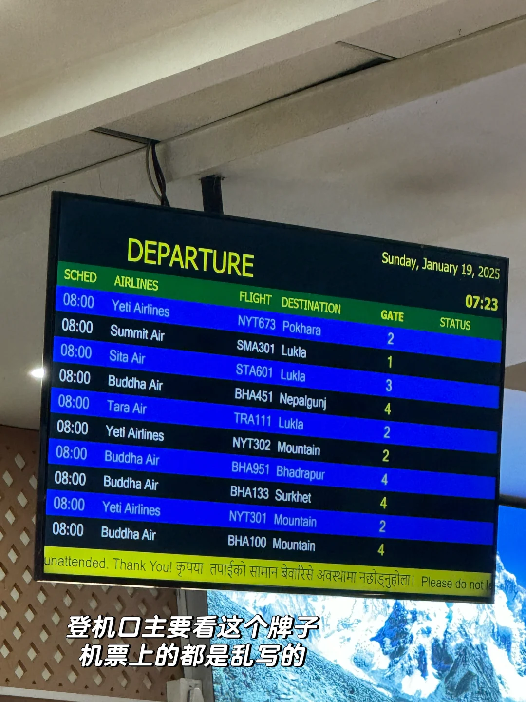 加德满都打车到Demostic,至少提前45mins左右,机票上的Gate登机口都是不准的,要到时候时刻听着广播和看显示屏,听到自己的航班号立刻冲就对了。