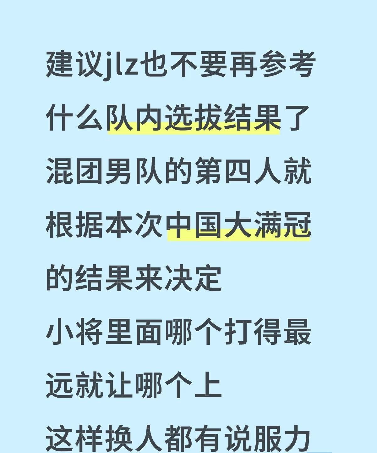 据说徐瑛彬是通过变味直通出来的,有幸运之神加持!一、不是全员直通选拔赛。二、即使部分选拔,也不是大循环。一一形式主义让徐瑛彬侥幸得出!所以,王励勤还是应该履行其一贯的脚踏实地的工作作风,采用全员大循环至少两轮的直通选拔赛以积分取高者。积分相同,也可教练领导层商定:如蒯曼与陈熠同分,则取蒯曼,左撇子易于搭档。