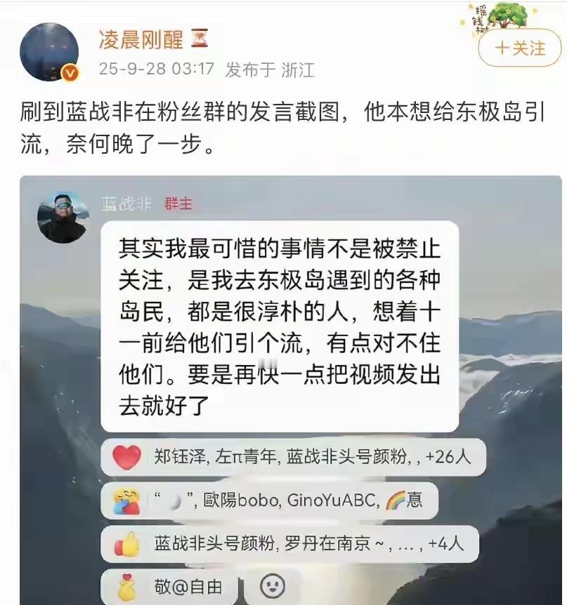 蓝战非被封后发声,他不可惜自己被禁言,只可惜没能在十一前发出最后一个视频,给浙江东极岛引流。 有人觉得他的生活方式会影响价值观,甚至认为更该封旭旭宝宝。但也有人支持蓝战非,觉得他的视频内容健康真实。 大家猜测,他被封的真正原因可能是说过不结婚、不相信爱情的话,担心影响结婚率和生育率。